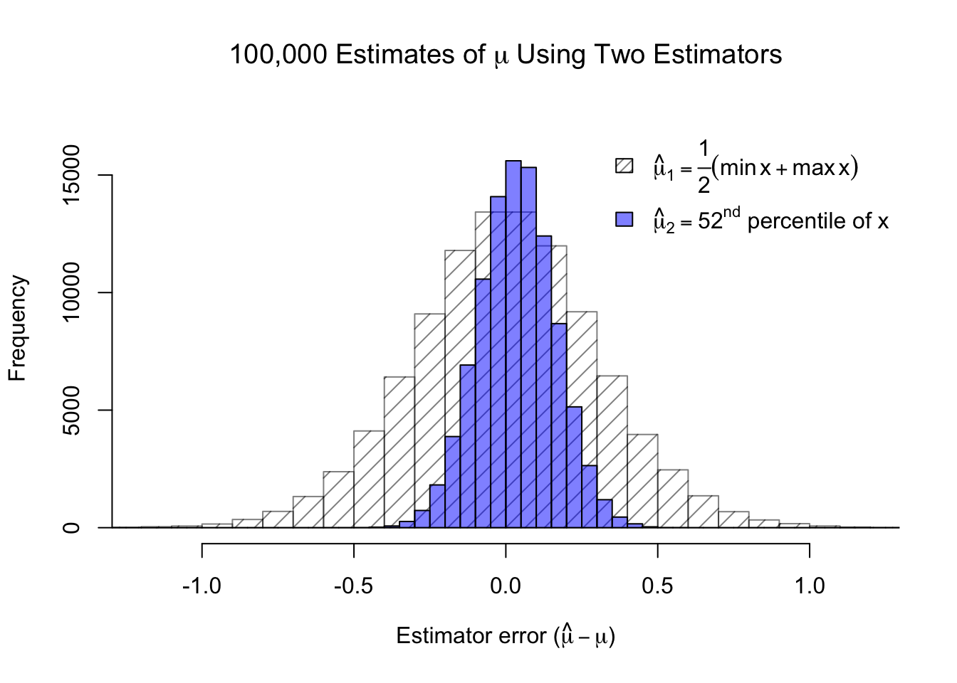 #bias-variance tradeoff of normal estimatorsset.seed(2001)norm.samp <-matrix(rnorm(10000000),ncol=100)norm.samp <-t(apply(norm.samp,1,sort))mu.est1 <- (norm.samp[,1]+norm.samp[,100])/2mu.est2 <- norm.samp[,52]hist(mu.est1,col='#00000080',density=10,breaks=seq(-1.6,1.6,0.1),ylim=c(0,17000),xlim=c(-1.2,1.2),main=expression(paste('100,000 Estimates of ',mu,' Using Two Estimators')),xlab=expression(paste('Estimator error (',hat(mu)-mu,')')))hist(mu.est2,col='#0000ff80',add=TRUE,breaks=seq(-1.6,1.6,0.05))legend(x='topright',legend=c(expression(hat(mu)[1] ==frac(1,2)(min(x)+max(x))),expression(paste(hat(mu)[2] ==52^nd,' percentile of x'))),density=c(20,-1),fill=c('#00000080','#0000ff80'),bty='n')