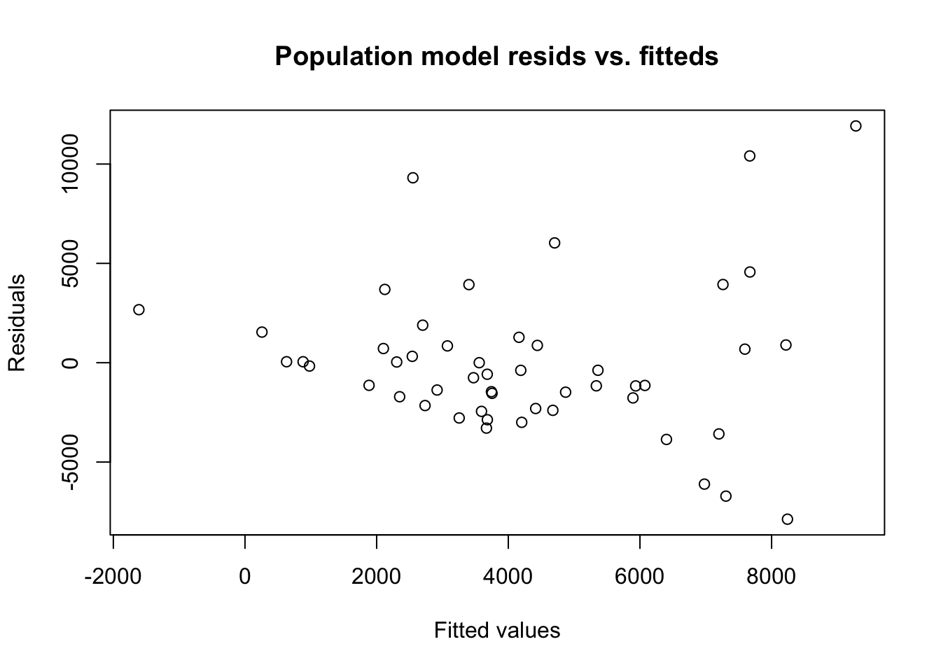Visual inspection of the resids versus the fitted values suggests a high level of heteroskedasticity, with low residuals (\(\pm 2000\)) for states with low predicted population and high residuals (\(\pm 7000\)) for states with high predicted populations.