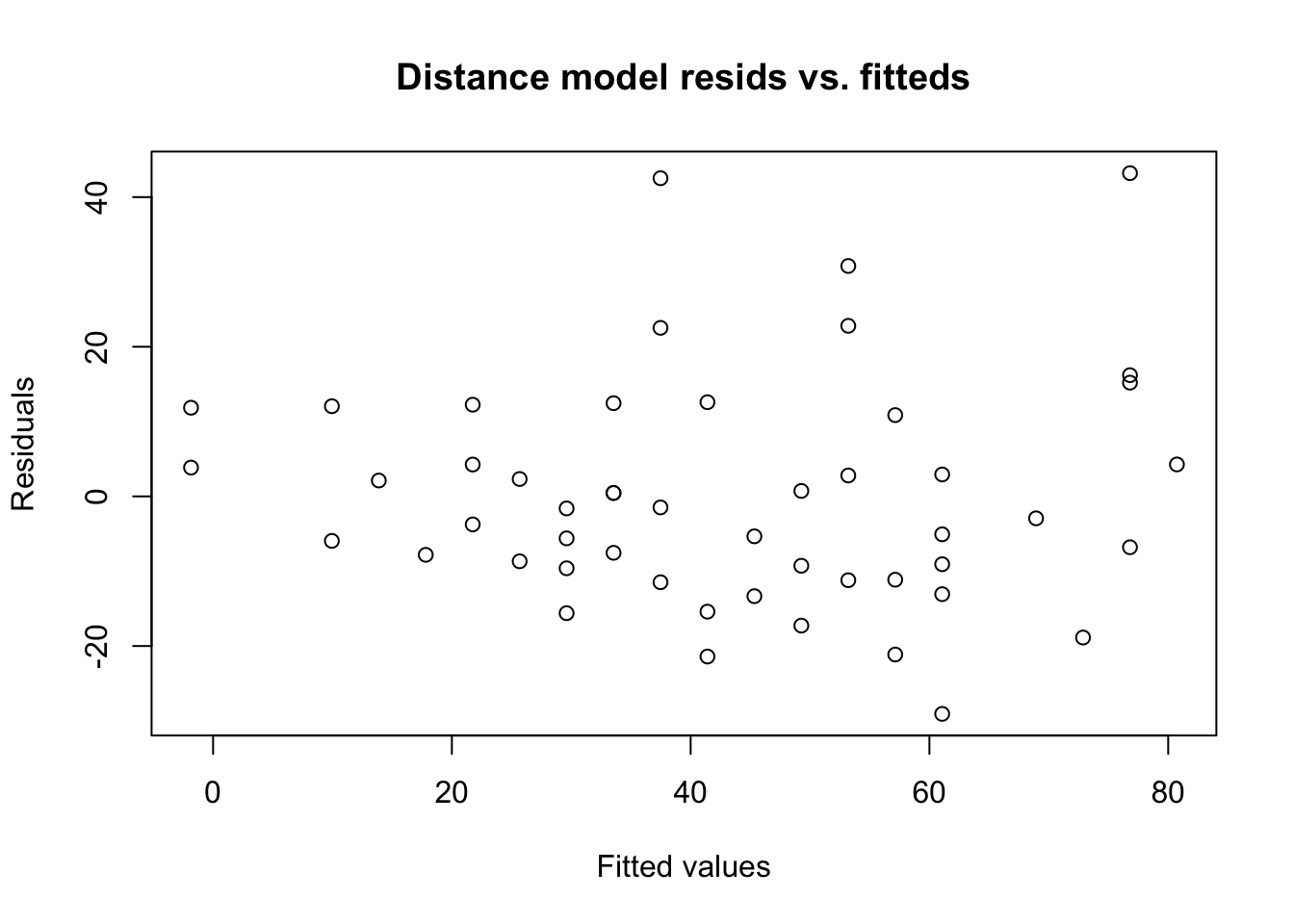 At the end of the day, these residuals seem workable. Depending on the diagnostic plotor test used, they either barely pass or barely fail most of our checks on the IID assumptions. Our background understanding of vehicle physics would suggest that these violations are real, but by reviewing the actual numbers, we do not have reason to believe that the violations will invalidate most top-level regression conclusions. Put another way, the fact that \(n=50\) is probably a bigger limitation for this model than any violations amidst the IID assumptions.