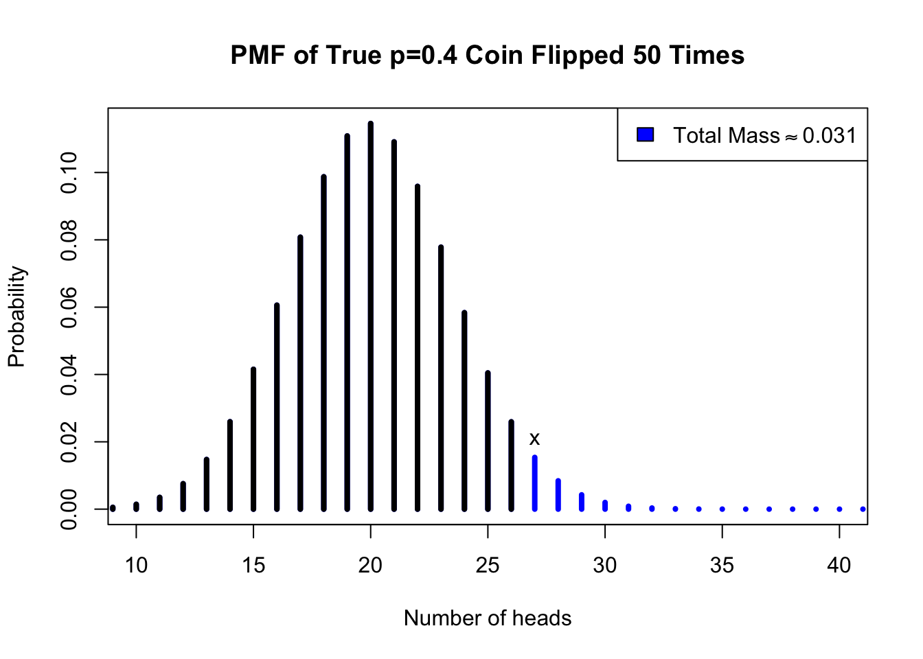 #coin hypothesis testplot(0:50,dbinom(0:50,50,0.4),type='h',lwd=4,xlim=c(10,40),main='PMF of True p=0.4 Coin Flipped 50 Times',col='blue',xlab='Number of heads',ylab='Probability')points(0:26,dbinom(0:26,50,0.4),type='h',lwd=4)text(27,dbinom(27,50,0.4),'x',pos=3)legend(x='topright',legend=expression('Total Mass'%~~%0.031),fill='blue')