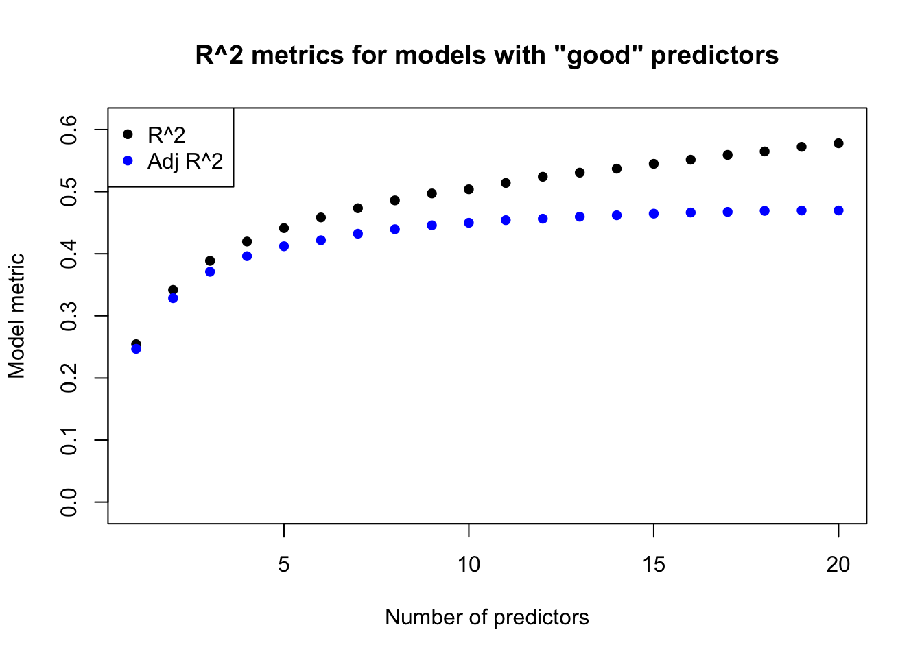 plot(1:20,adjr2b.r2,main='R^2 metrics for models with "good" predictors',xlab='Number of predictors',ylab='Model metric',pch=16,ylim=c(-0.01,0.61))points(1:20,adjr2b.adjr2,pch=16,col='#0000ff')legend(x='topleft',pch=16,col=c('black','#0000ff'),legend=c('R^2','Adj R^2'))