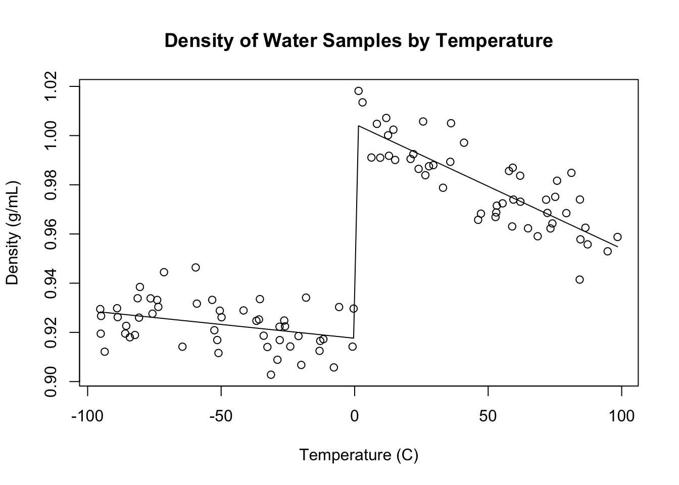 set.seed(2003)temp <-runif(100,-100,100)dens <-0.915-0.00015*temp+rnorm(100,0,0.01)dens[temp>0] <- dens[temp>0]+0.085-0.00025*temp[temp>0]plot(temp,dens,main='Density of Water Samples by Temperature',ylab='Density (g/mL)',xlab='Temperature (C)')dens.lm <-lm(dens~temp*I(temp>0))lines(sort(temp),dens.lm$fitted.values[order(temp)])