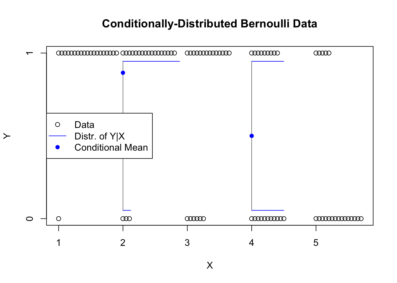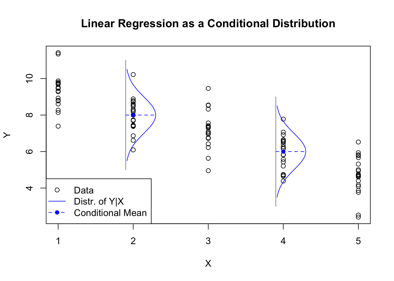 set.seed(1892)glm.norm.y <-10-rep(1:5,each=20) +rnorm(100)plot(rep(1:5,each=20),glm.norm.y,ylab='Y',xlab='X',main='Linear Regression as a Conditional Distribution')segments(x0=c(1.9,3.9),y0=c(5,3),y1=c(11,9),col='grey50')lines(1.9+dnorm(seq(10.5,5.5,-0.05),8,1),seq(10.5,5.5,-0.05),col='#0000ff')lines(3.9+dnorm(seq(8.5,3.5,-0.05),6,1),seq(8.5,3.5,-0.05),col='#0000ff')segments(x0=c(1.9,3.9),y0=c(8,6),x1=c(1.9,3.9)+dnorm(0),col='#0000ff',lty=2)points(c(2,4),c(8,6),pch=16,col='#0000ff')legend(x='bottomleft',pch=c(1,NA,16),lty=c(NA,1,2),col=c('black','#0000ff','#0000ff'),legend=c('Data','Distr. of Y|X','Conditional Mean'))