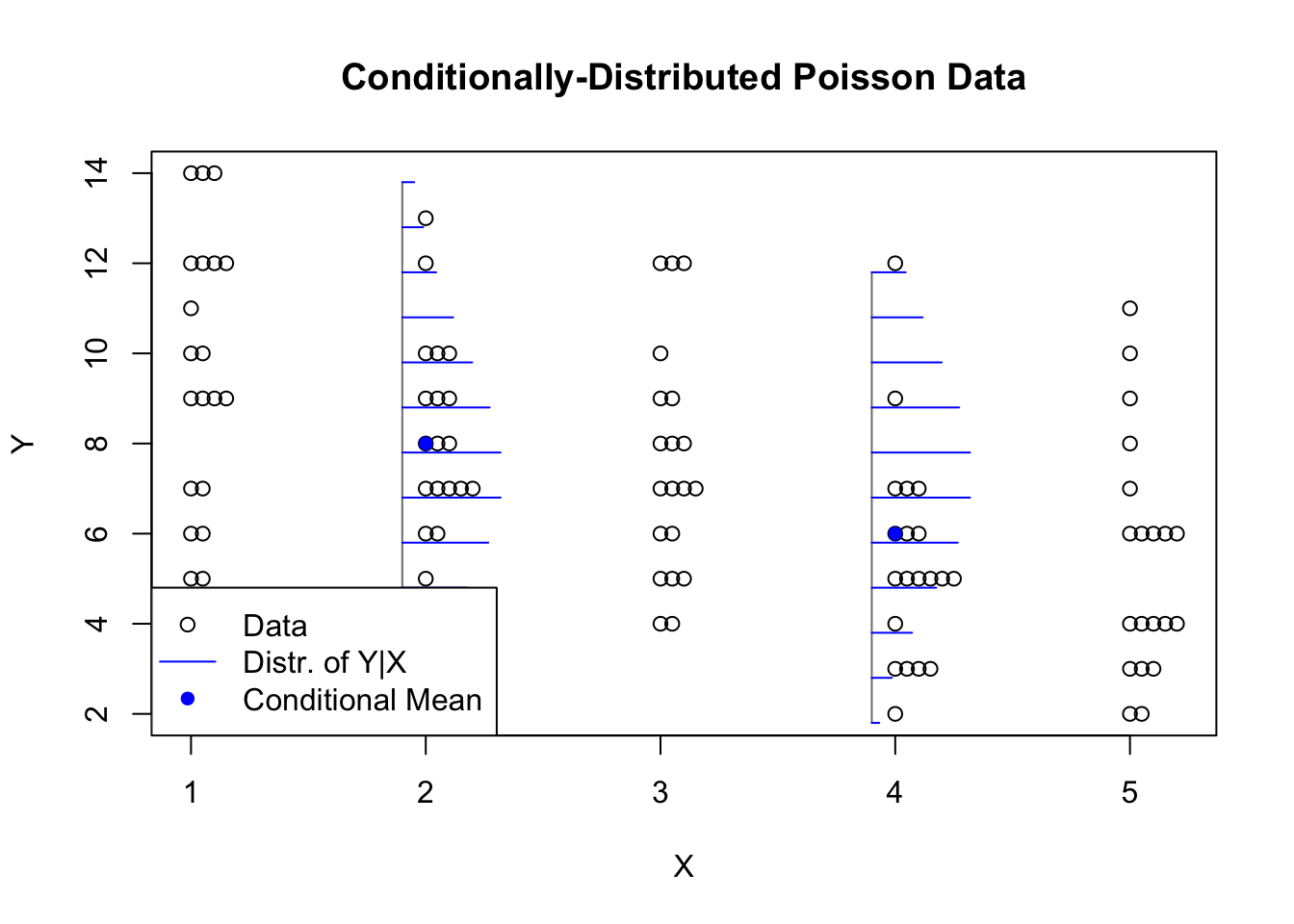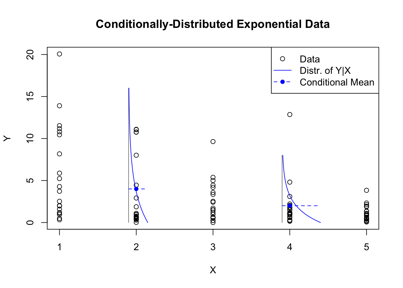 glm.exp.y <-rexp(100,1/rep(5:1,each=20))plot(rep(1:5,each=20),glm.exp.y,ylab='Y',xlab='X',main='Conditionally-Distributed Exponential Data')segments(x0=c(1.9,3.9),y0=c(0,0),y1=c(16,8),col='grey50')lines(1.9+dexp(seq(16,0,-0.1),1/4),seq(16,0,-0.1),col='#0000ff')lines(3.9+dexp(seq(8,0,-0.05),1/2),seq(8,0,-0.05),col='#0000ff')segments(x0=c(1.9,3.9),y0=c(4,2),x1=c(1.9,3.9)+c(1/4,1/2),col='#0000ff',lty=2)points(c(2,4),c(4,2),pch=16,col='#0000ff')legend(x='topright',pch=c(1,NA,16),lty=c(NA,1,2),col=c('black','#0000ff','#0000ff'),legend=c('Data','Distr. of Y|X','Conditional Mean'))