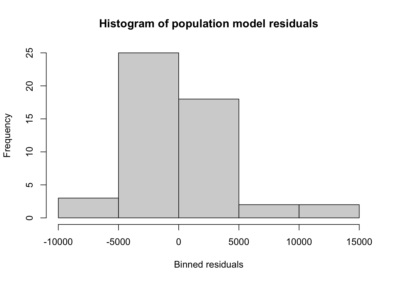 hist(state.lm$residuals,main='Histogram of population model residuals',