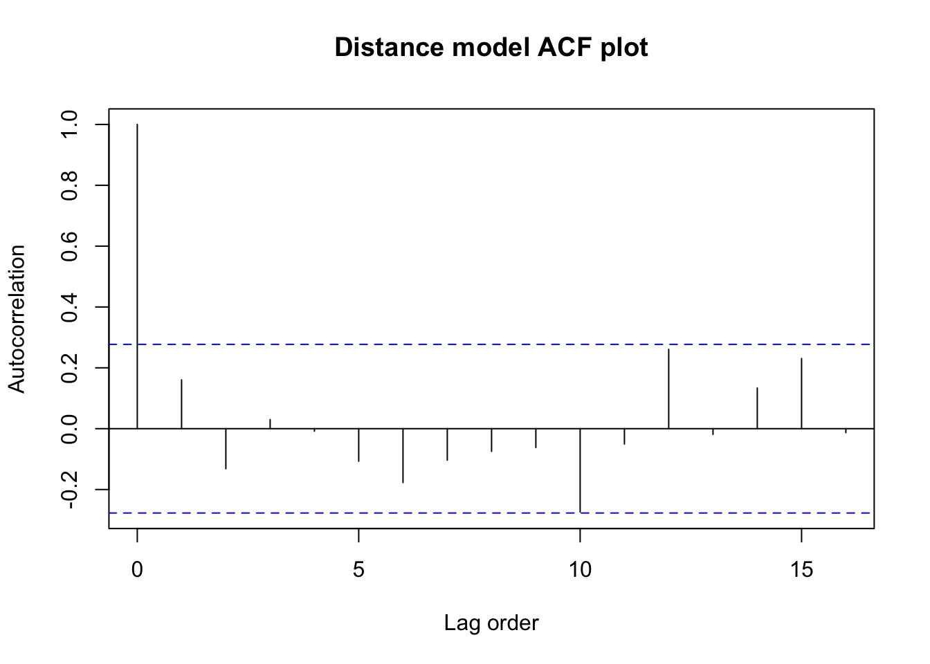 acf(car.lm$residuals,main='Distance model ACF plot',