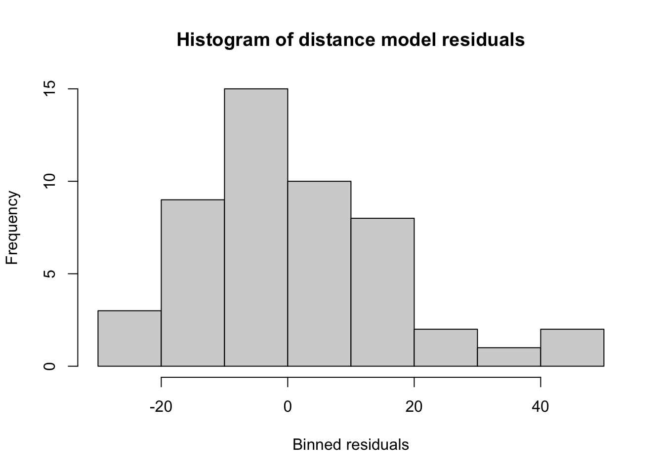 hist(car.lm$residuals,main='Histogram of distance model residuals',