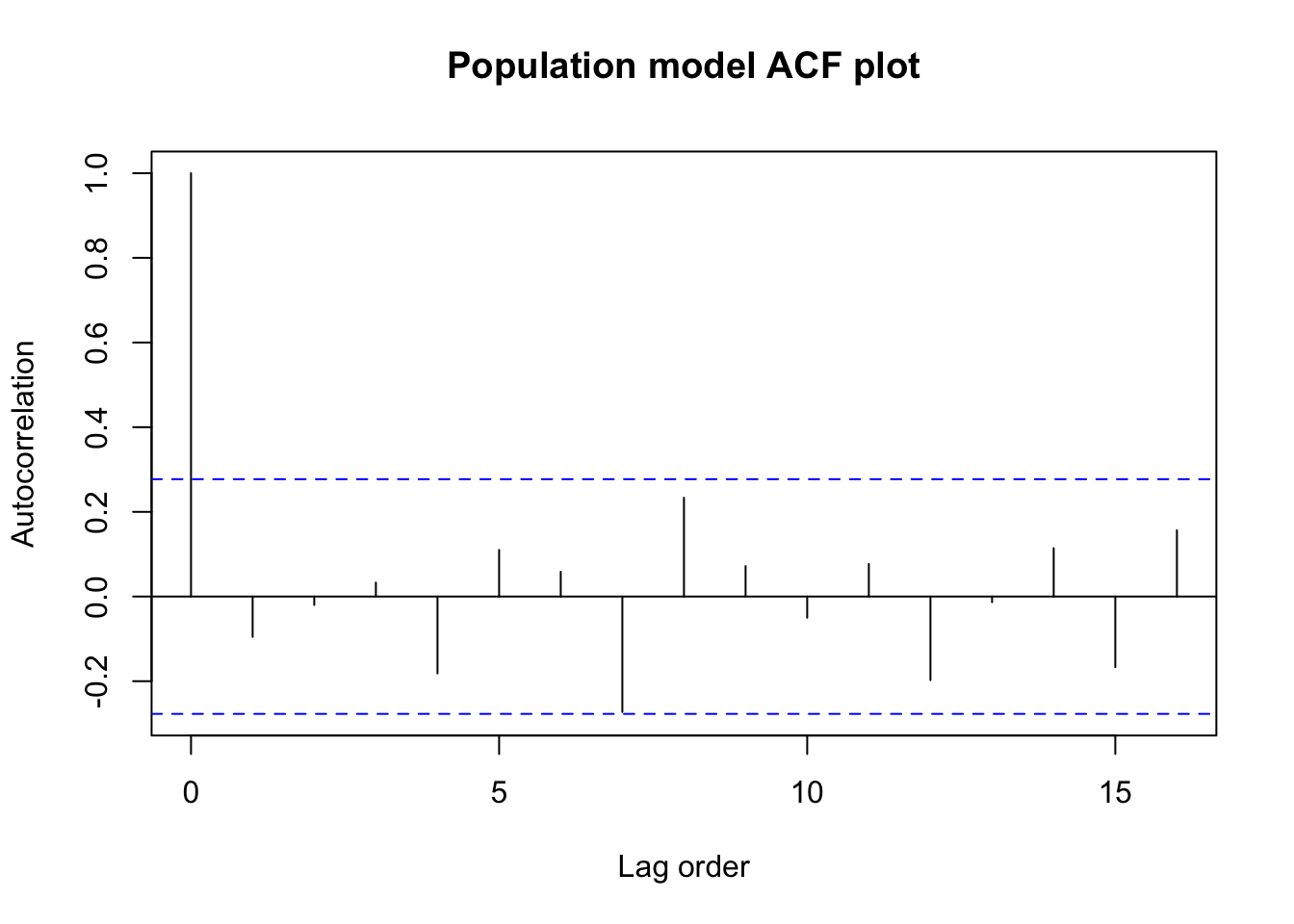 Nothing seems too suspicious here. There are small amounts of positive and negative correlation at Lag 1 and at all higher-order lags, but none of it seems greater than what we might expect from chance alone (the blue dashed bars).