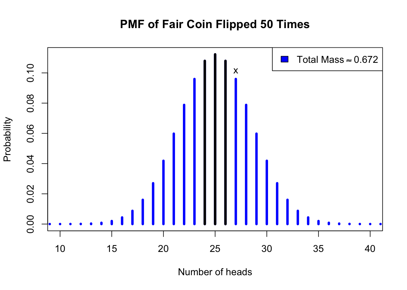 #coin hypothesis testplot(0:50,dbinom(0:50,50,0.5),type='h',lwd=4,xlim=c(10,40),main='PMF of Fair Coin Flipped 50 Times',col='blue',xlab='Number of heads',ylab='Probability')points(24:26,dbinom(24:26,50,0.5),type='h',lwd=4)text(27,dbinom(27,50,0.5),'x',pos=3)legend(x='topright',legend=expression('Total Mass'%~~%0.672),fill='blue')