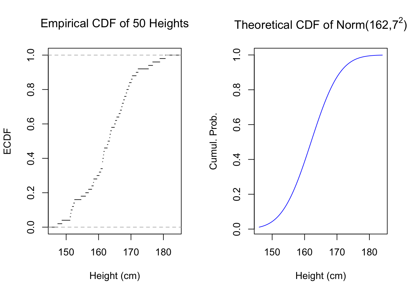 #empirical cdfpar(mfrow=c(1,2))set.seed(1977)hgt50 <-round(rnorm(50,165,7),1)plot(ecdf(hgt50),do.points=FALSE,main=expression('Empirical CDF of 50 Heights'),xlab='Height (cm)',ylab='ECDF',xlim=c(146,184))plot(seq(146,184,0.1),pnorm(seq(146,184,0.1),162,7),type='l',col='#0000ff',main=expression(paste('Theoretical CDF of Norm(162,',7^2,')')),ylab='Cumul. Prob.',xlab='Height (cm)',xlim=c(146,184))
