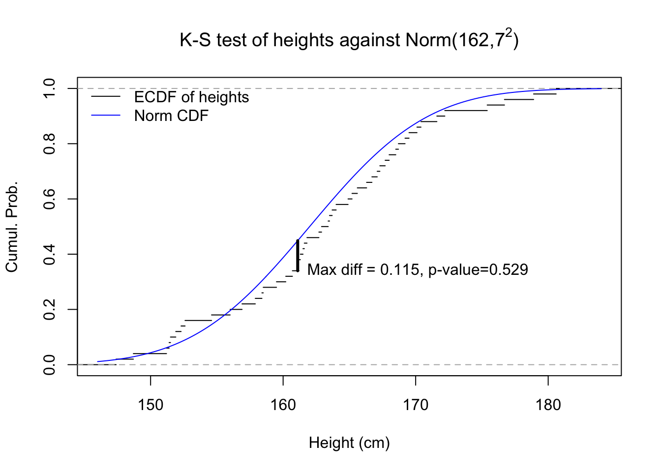 #k-s testkst <-suppressWarnings(ks.test(hgt50,pnorm,mean=162,sd=7))Fhgt <-sapply(seq(146,184,0.1),function(z){mean(hgt50<=z)})Fnorm <-pnorm(seq(146,184,0.1),162,7)plot(ecdf(hgt50),do.points=FALSE,main=expression(paste('K-S test of heights against Norm(162,',7^2,')')),xlab='Height (cm)',ylab='Cumul. Prob.',xlim=c(146,184))lines(seq(146,184,0.1),Fnorm,col='#0000ff')k_max <-order(abs(Fnorm-Fhgt),decreasing=TRUE)[1]x_max <-seq(146,184,0.1)[152]segments(x0=x_max,x1=x_max,y0=Fhgt[k_max],y1=Fnorm[k_max],lwd=3)legend(x='topleft',bty='n',lwd=1,col=c('#000000','#0000ff'),legend=c('ECDF of heights','Norm CDF'))text(x=x_max,y=Fhgt[k_max],label='Max diff = 0.115, p-value=0.529',pos=4)