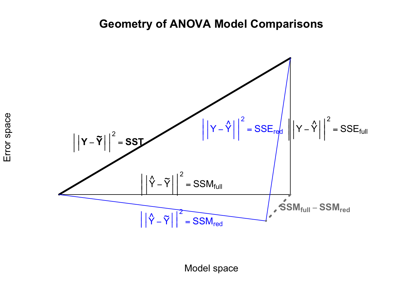vec.length <-function(v) sqrt(v%*%v)X <-c(1,2,3,4,5)Y <-c(6,8,6,2,3)Yhat <-lm(Y~X)$fitted.valuese <-lm(Y~X)$residualsplot(x=NA,y=NA,xlim=c(0,5),ylim=c(-0.6,3.2),xlab='Model space',ylab='Error space',axes=FALSE,main='Geometry of ANOVA Model Comparisons')lines(x=c(vec.length(Yhat-mean(Y)),0),y=c(vec.length(e),0),lwd=3)lines(x=c(0,vec.length(Yhat-mean(Y)),vec.length(Yhat-mean(Y))),y=c(0,0,vec.length(e)))lines(x=c(0,vec.length(Yhat-mean(Y))-0.4,vec.length(Yhat-mean(Y))),y=c(0,0-0.6,vec.length(e)),col='#0000ff')lines(x=c(vec.length(Yhat-mean(Y)),vec.length(Yhat-mean(Y))-0.4),y=c(0,-0.6),col='grey50',lwd=3,lty=3)text(x=0.8,y=1.2,labels=expression(bold(bgroup('|',bgroup('|',Y-tilde(Y),'|'),'|')^2==SST)))text(x=2,y=0.25,labels=expression(bgroup('|',bgroup('|',hat(Y)-tilde(Y),'|'),'|')^2==SSM[full]))text(x=2,y=-0.6,labels=expression(bgroup('|',bgroup('|',hat(Y)-tilde(Y),'|'),'|')^2==SSM[red]),col='#0000ff')text(x=4.4,y=1.5,labels=expression(bgroup('|',bgroup('|',Y-hat(Y),'|'),'|')^2==SSE[full]))text(x=3,y=1.5,labels=expression(bgroup('|',bgroup('|',Y-hat(Y),'|'),'|')^2==SSE[red]),col='#0000ff')text(x=4.2,y=-0.3,labels=expression(bold(SSM[full]-SSM[red])),col='grey50')