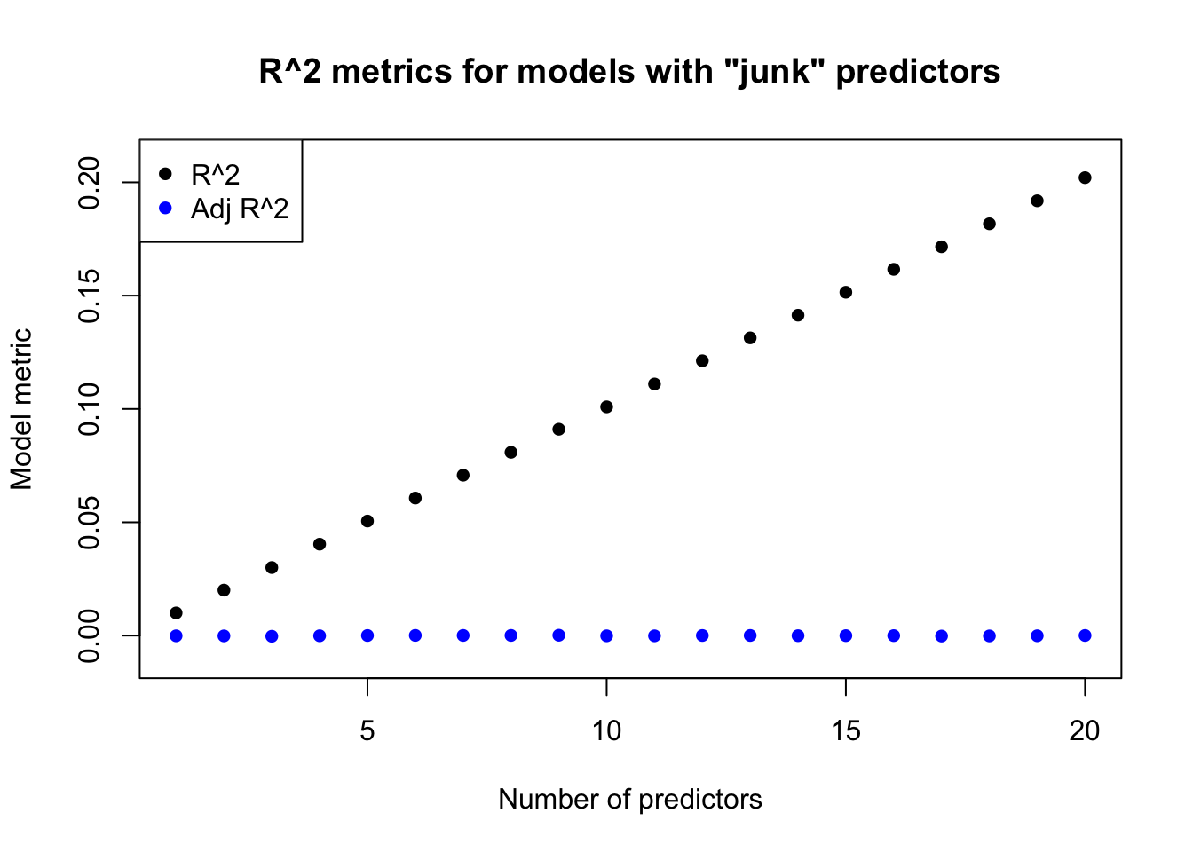 #penalty rate of adjusted r^2 (will take time to run)library(MASS)set.seed(8192)adjr2.sims <-array(rnorm(21*100*10000),dim=c(100,21,10000))adjr2.r2 <-rowMeans(apply(adjr2.sims,3,function(z)sapply(2:21,function(y) summary(lm(z[,1]~z[,2:y]))$r.squared)))adjr2.adjr2 <-rowMeans(apply(adjr2.sims,3,function(z)sapply(2:21,function(y) summary(lm(z[,1]~z[,2:y]))$adj.r.squared)))adjr2.Sigma <-matrix(0.5,nrow=21,ncol=21)diag(adjr2.Sigma) <-1adjr2b.r2 <-rowMeans(replicate(n=10000,sapply(2:21,function(z){ tmp <-mvrnorm(100,rep(0,21),adjr2.Sigma)summary(lm(tmp[,1]~tmp[,2:z]))$r.squared})))adjr2b.adjr2 <-rowMeans(replicate(n=10000,sapply(2:21,function(z){ tmp <-mvrnorm(100,rep(0,21),adjr2.Sigma)summary(lm(tmp[,1]~tmp[,2:z]))$adj.r.squared})))plot(1:20,adjr2.r2,main='R^2 metrics for models with "junk" predictors',xlab='Number of predictors',ylab='Model metric',pch=16,ylim=c(-0.01,0.21))points(1:20,adjr2.adjr2,pch=16,col='#0000ff')legend(x='topleft',pch=16,col=c('black','#0000ff'),legend=c('R^2','Adj R^2'))