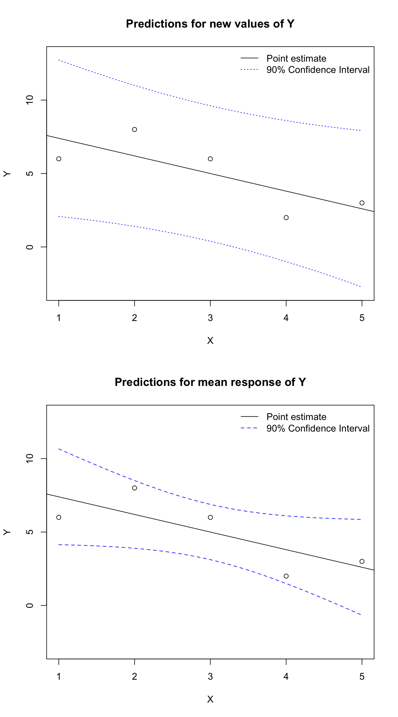 X <-c(1,2,3,4,5)Y <-c(6,8,6,2,3)y0 <-predict(lm(Y~X),newdata=data.frame(X=seq(1,5,0.1)),level=0.9,interval='prediction')mu0 <-predict(lm(Y~X),newdata=data.frame(X=seq(1,5,0.1)),level=0.9,interval='confidence')par(mfrow=c(2,1))plot(X,Y,ylim=c(-3,13),main='Predictions for new values of Y')abline(reg=lm(Y~X))lines(seq(1,5,0.1),y0[,2],lty=3,col='#0000ff')lines(seq(1,5,0.1),y0[,3],lty=3,col='#0000ff')legend(x='topright',bty='n',lty=c(1,3),col=c('#000000','#0000ff'),legend=c('Point estimate','90% Confidence Interval'))plot(X,Y,ylim=c(-3,13),main='Predictions for mean response of Y')abline(reg=lm(Y~X))lines(seq(1,5,0.1),mu0[,2],lty=2,col='#0000ff')lines(seq(1,5,0.1),mu0[,3],lty=2,col='#0000ff')legend(x='topright',bty='n',lty=c(1,2),col=c('#000000','#0000ff'),legend=c('Point estimate','90% Confidence Interval'))