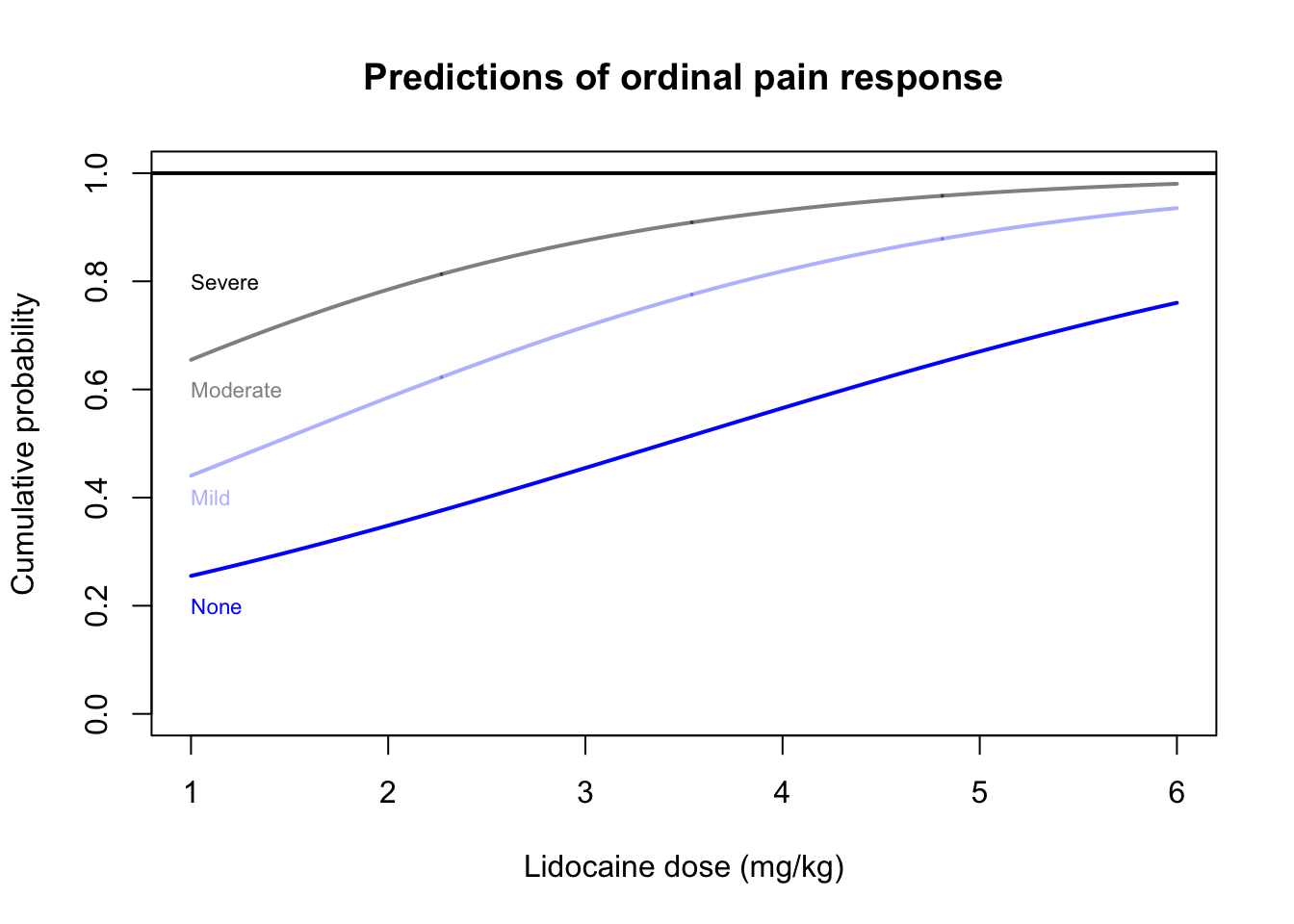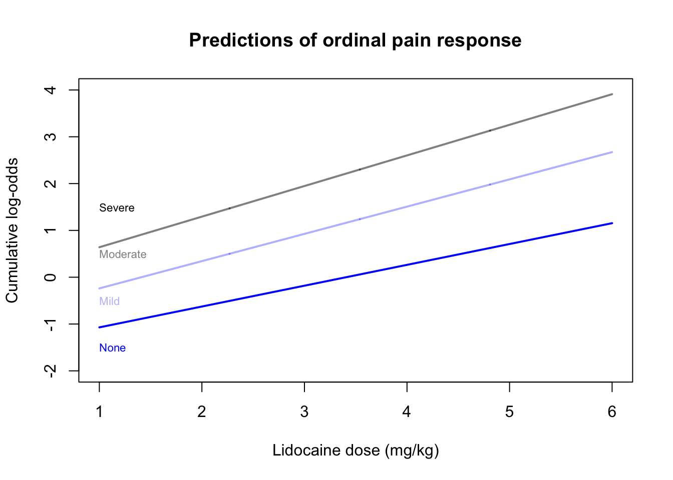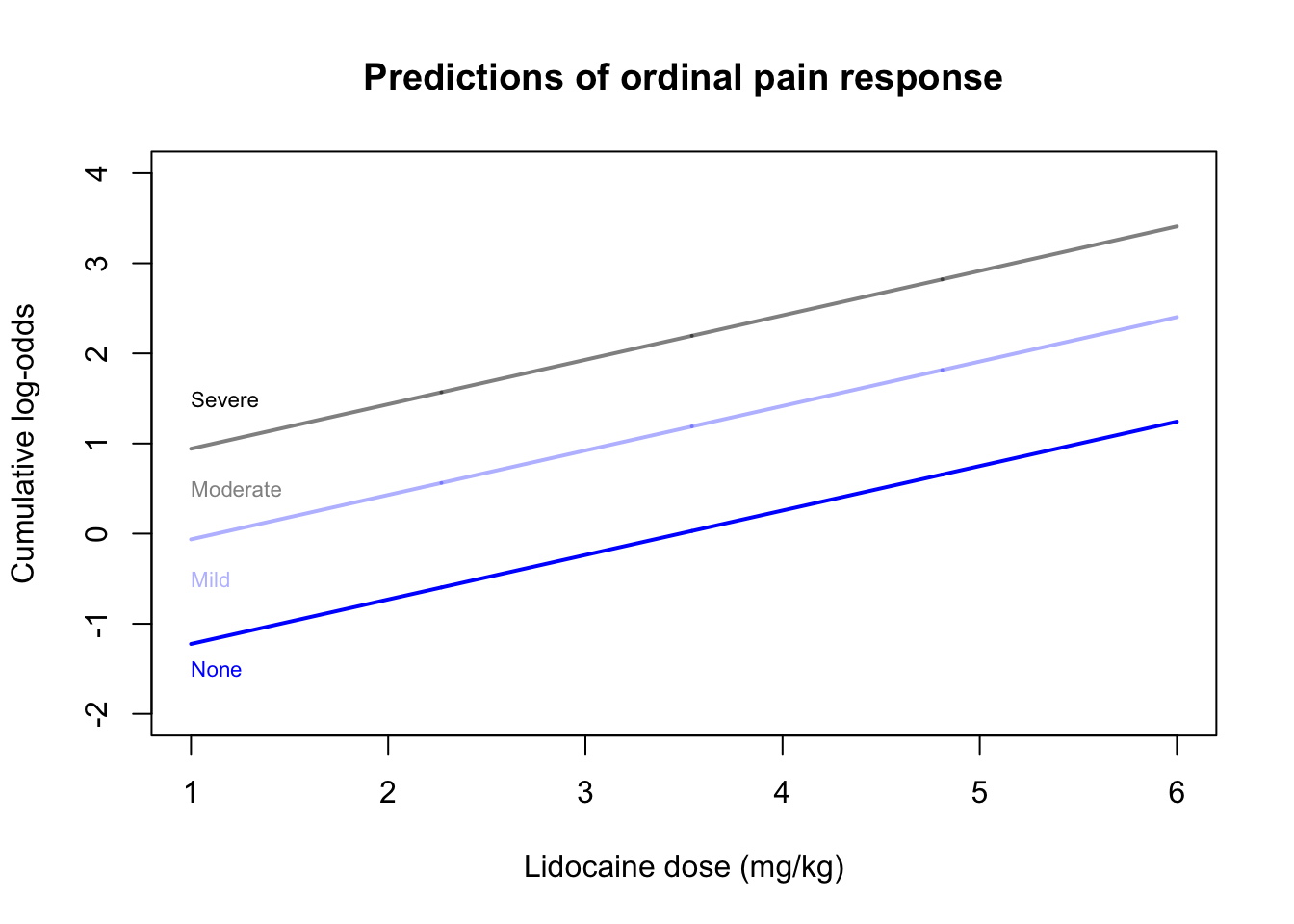 plot(x=c(1,6),y=c(-2,4),type='n',main='Predictions of ordinal pain response',ylab='Cumulative log-odds',xlab='Lidocaine dose (mg/kg)')lines(x=xseq$dose,y=predictvglm(pain.olr,newdata=xseq,type='link')[,1],col=pocolors[1],lwd=2)lines(x=xseq$dose,y=predictvglm(pain.olr,newdata=xseq,type='link')[,2],col=pocolors[2],lwd=2)lines(x=xseq$dose,y=predictvglm(pain.olr,newdata=xseq,type='link')[,3],col=pocolors[3],lwd=2)text(x=1,c(-1.5,-0.5,0.5,1.5),levels(pain_cat),adj=0,col=pocolors,cex=0.7)