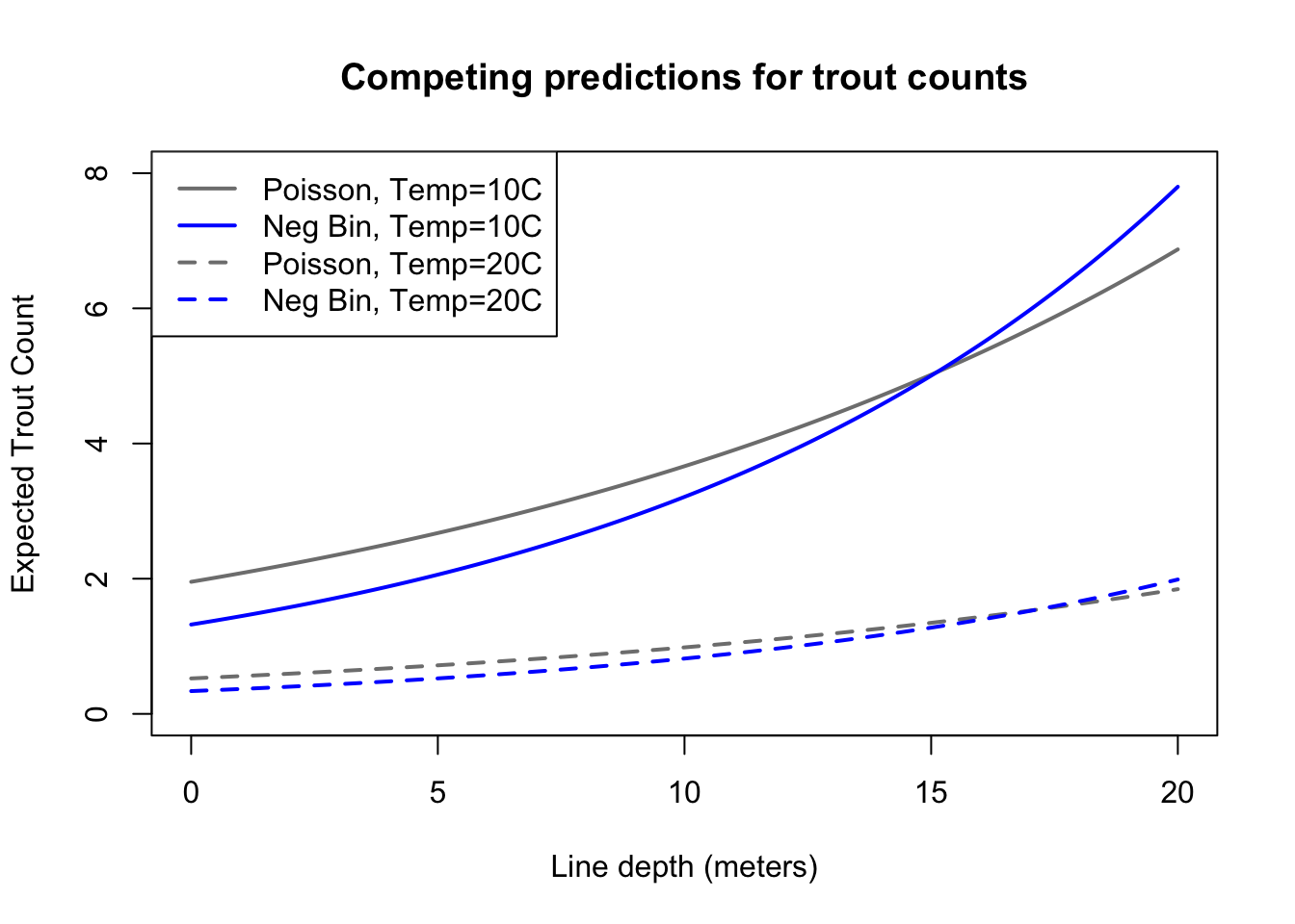 Here we must leave our fisher to their final determination that line depth does matter when selecting a spot for trout fishing, though perhaps not as much as water temperature. Next (in ?sec-zeroinflatedmodels) we will turn to a special type of over- or under-dispersion which describes data with an unexpectedly large or small number of zero counts.