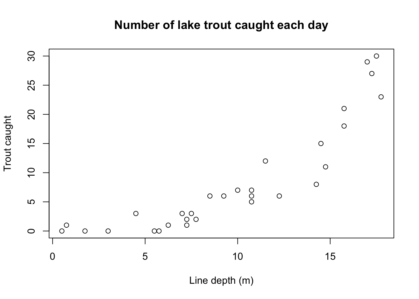 plot(depth,trout,main='Number of lake trout caught each day',