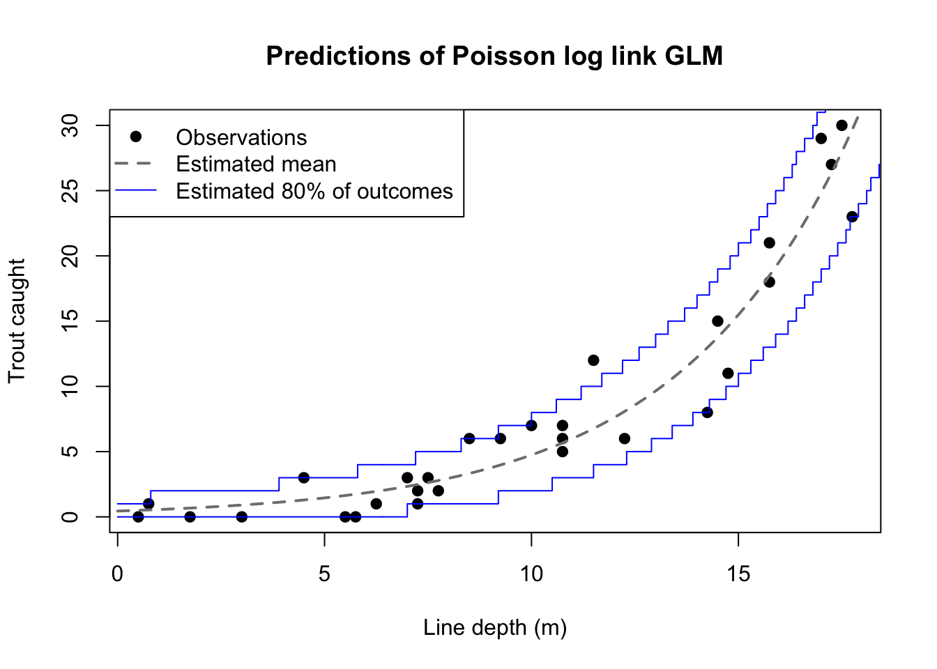 The figure above re-plots the trout catches alongside a curved line representing the fitted mean trout catch (also the fitted Poisson intensity) at each depth. The figure also shows bounds corresponding to the 10th and 90th percentiles from the Poisson distribution with these same fitted intensities. This window isn’t a confidence interval. It simply assumes that the fitted means are exactly correct (they won’t be), and shows the range of counts made likely by those fitted means. The heteroskedasticity of the data isn’t very clear from this example, but the vertical distances inside the boundary lines grow as depth increases. For example, when the depth is 5 meters, the fitted mean is 1.45 trout and with that mean we would expect to catch between 0 and 3 trout. But when the depth is 15 meters, the fitted mean is 15.49 trout and with that mean we would expect to catch between 11 and 21 trout.