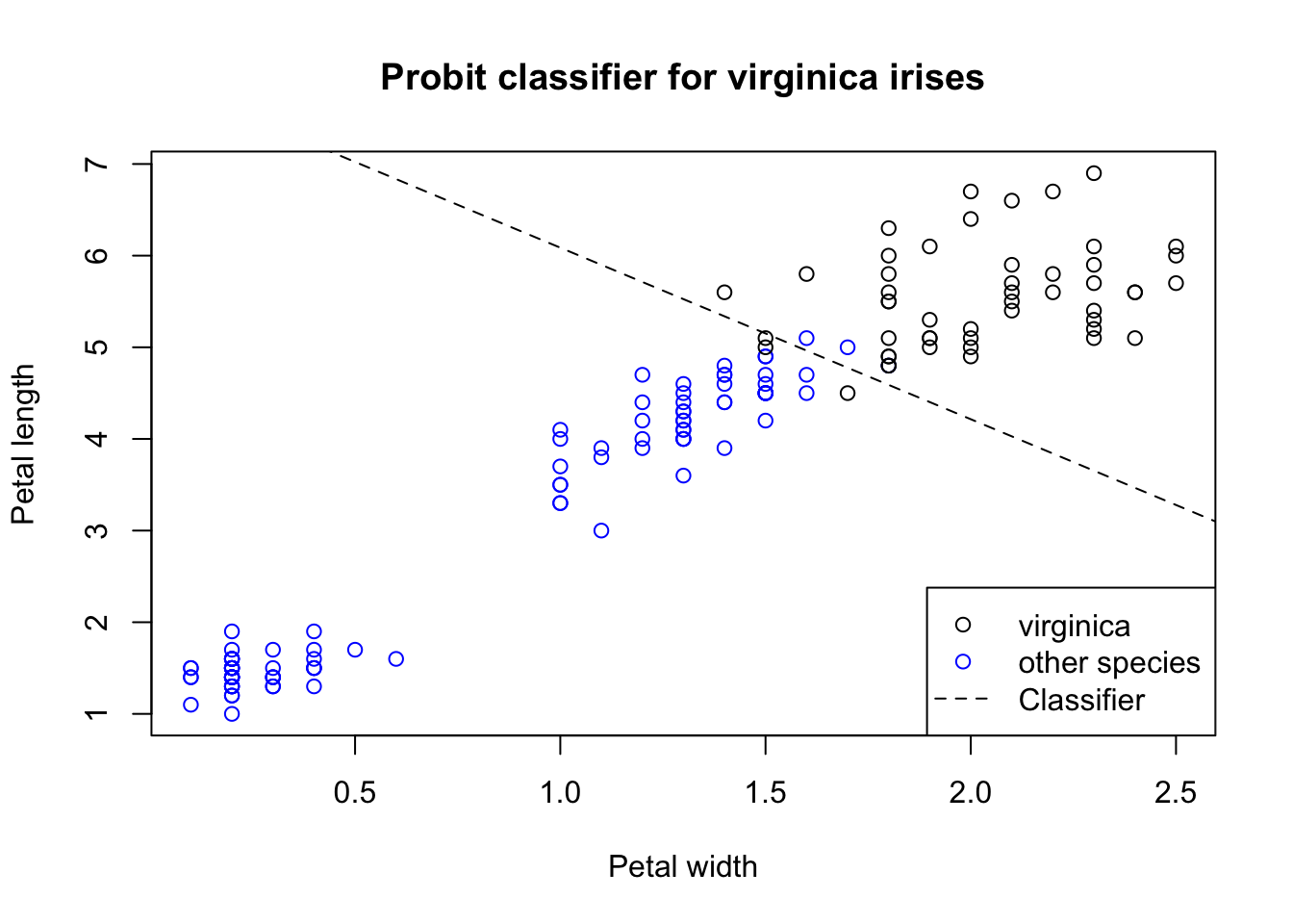 We can use our coefficients to define the two-dimensional classification boundary, a line which separates those iris flowers which the model would classify as Iris virginica from the rest. Recall that the 50-50 dividing line will have the property that \(\boldsymbol{x \hat{\beta}} = 0\), since \(\Phi(0) = 0.5\), or in other words, since the median of the standard normal distribution is 0.