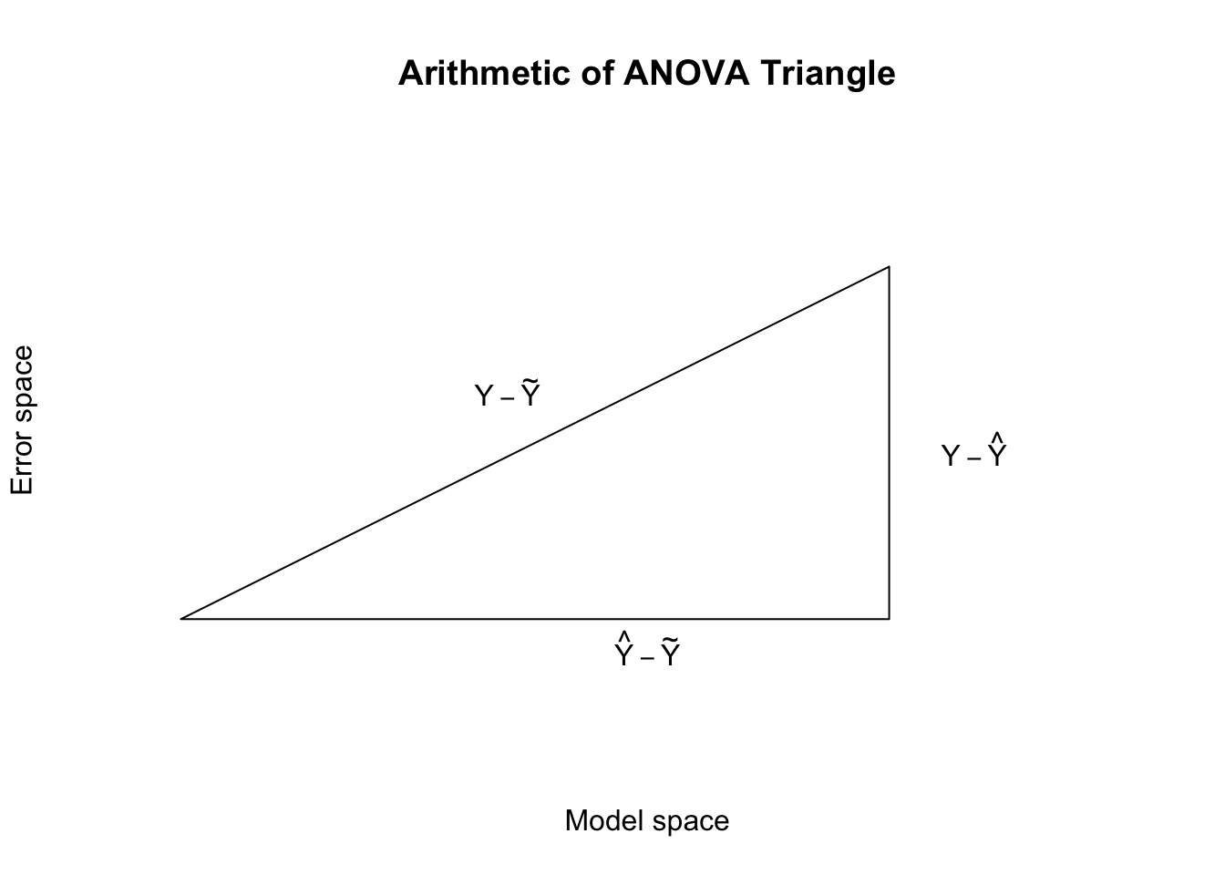 X <-c(1,2,3,4,5)Y <-c(6,8,6,2,3)Yhat <-lm(Y~X)$fitted.valuese <-lm(Y~X)$residualsvec.length <-function(z) sqrt(c(z%*%z))plot(x=NA,y=NA,xlim=c(0,5),ylim=c(-0.5,4),xlab='Model space',ylab='Error space',axes=FALSE,main='Arithmetic of ANOVA Triangle')lines(x=c(0,vec.length(Yhat-mean(Y)),vec.length(Yhat-mean(Y)),0),y=c(0,0,vec.length(e),0))text(x=1.75,y=2,labels=expression(Y-tilde(Y)))text(x=2.5,y=-0.25,labels=expression(hat(Y)-tilde(Y)))text(x=4.25,y=1.5,labels=expression(Y-hat(Y)))