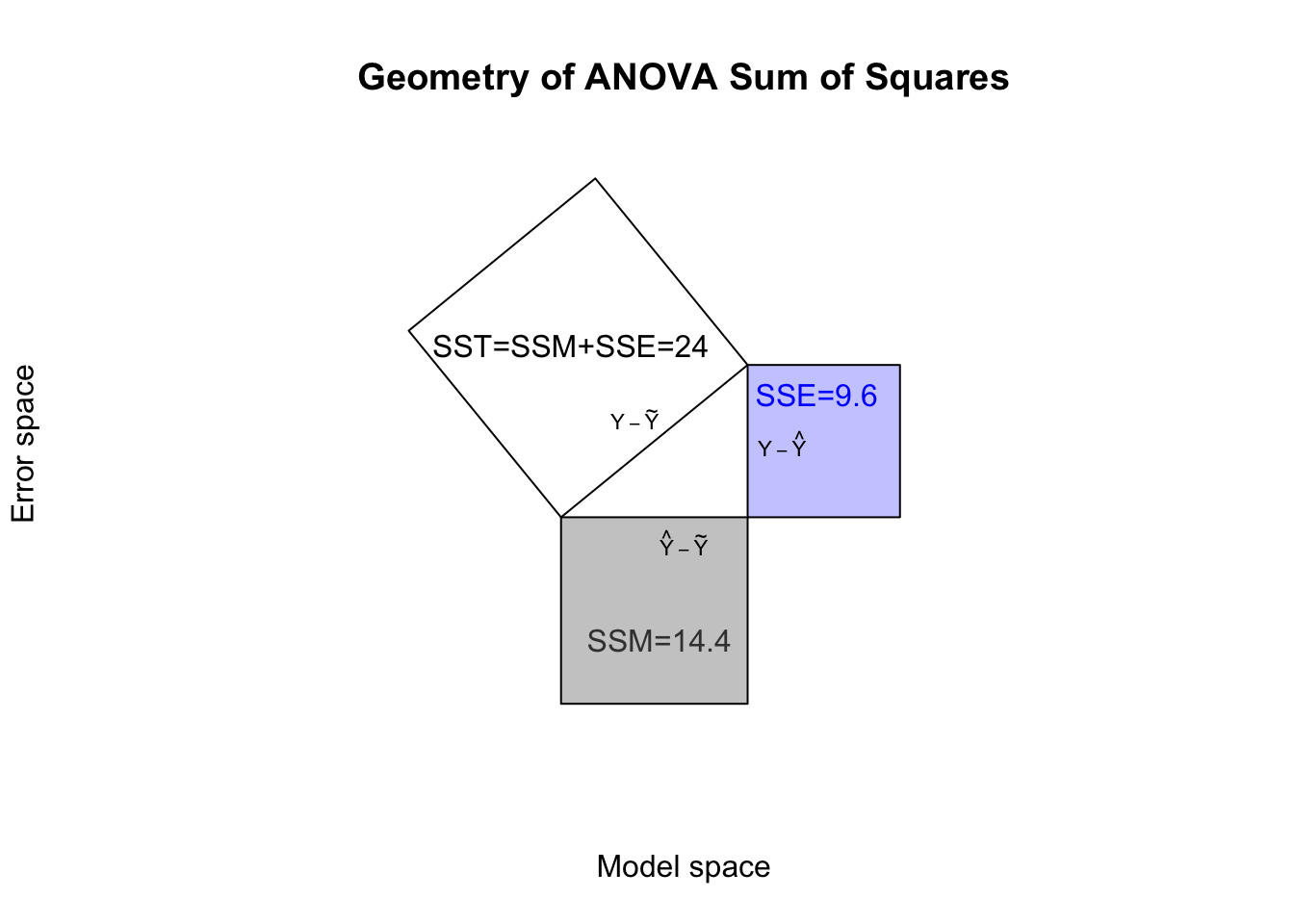 plot(x=NA,y=NA,xlim=c(-3,8),ylim=c(-4,7),xlab='Model space',ylab='Error space',axes=FALSE,main='Geometry of ANOVA Sum of Squares',asp=1)polygon(x=c(0,vec.length(Yhat-mean(Y)),vec.length(Yhat-mean(Y))-vec.length(e),-vec.length(e)),y=c(0,vec.length(e),vec.length(e)+vec.length(Yhat-mean(Y)),vec.length(Yhat-mean(Y))))polygon(x=c(0,vec.length(Yhat-mean(Y)),vec.length(Yhat-mean(Y)),0),y=c(0,0,-vec.length(Yhat-mean(Y)),-vec.length(Yhat-mean(Y))),col='#0000003f')polygon(x=c(vec.length(Yhat-mean(Y)),vec.length(Yhat-mean(Y)),vec.length(Yhat-mean(Y))+vec.length(e),vec.length(Yhat-mean(Y))+vec.length(e)),y=c(0,vec.length(e),vec.length(e),0),col='#0000ff3f')text(x=1.5,y=2,labels=expression(Y-tilde(Y)),cex=0.7)text(x=2.5,y=-0.5,labels=expression(hat(Y)-tilde(Y)),cex=0.7)text(x=4.5,y=1.5,labels=expression(Y-hat(Y)),cex=0.7)text(x=0.2,y=3.5,labels='SST=SSM+SSE=24')text(x=2,y=-2.5,labels='SSM=14.4',col='#3f3f3f')text(x=5.2,y=2.5,labels='SSE=9.6',col='#0000ff')