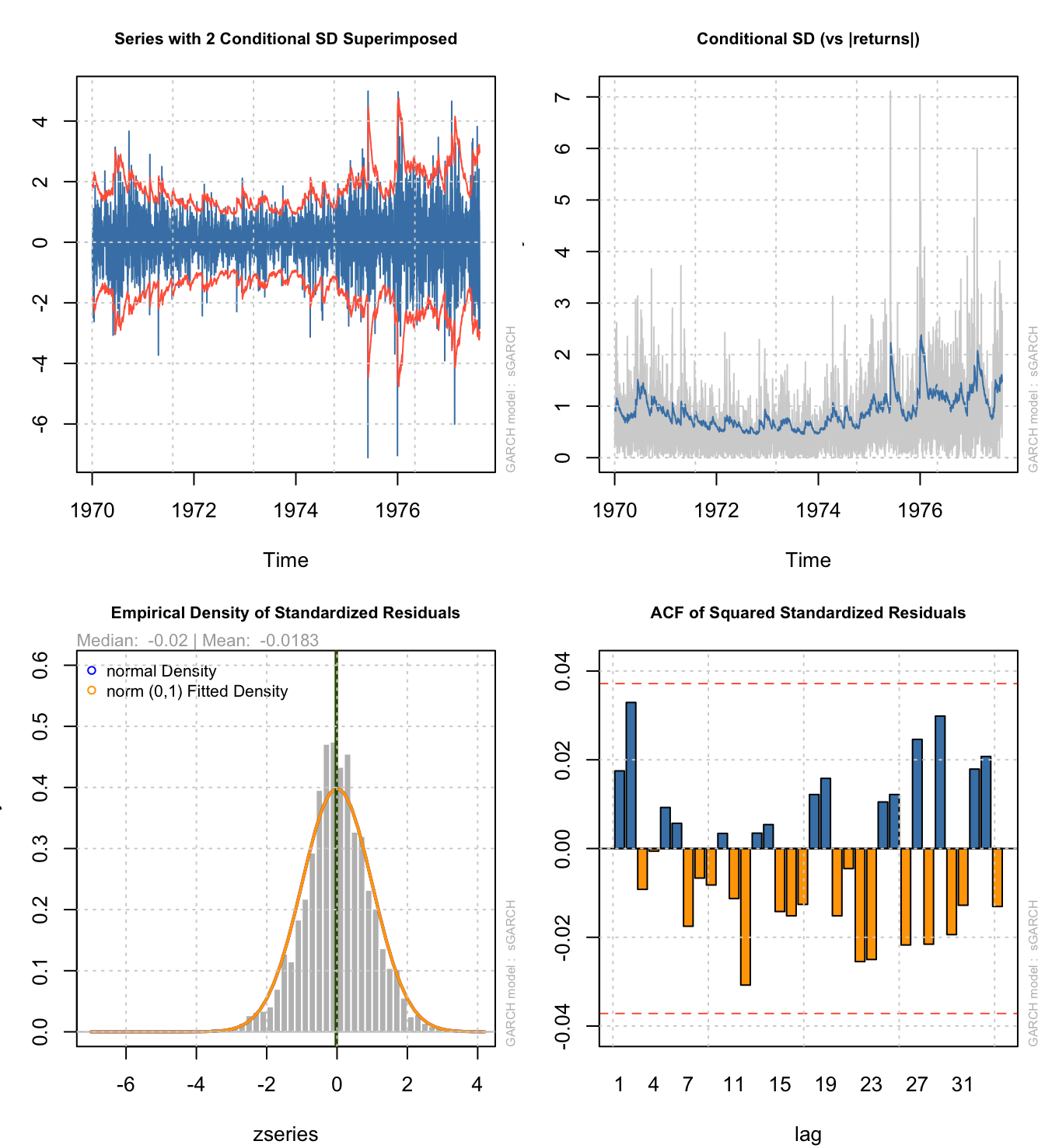 The rugarch package also contains most of the same plotting tools as fGarch: