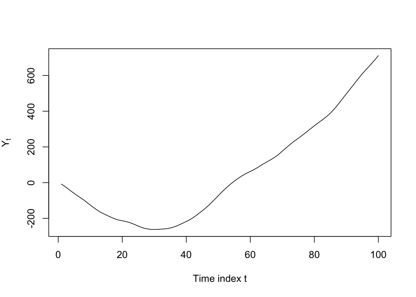 plot(Y[4:103],type='l',ylab=expression(Y[t]),xlab='Time index t')