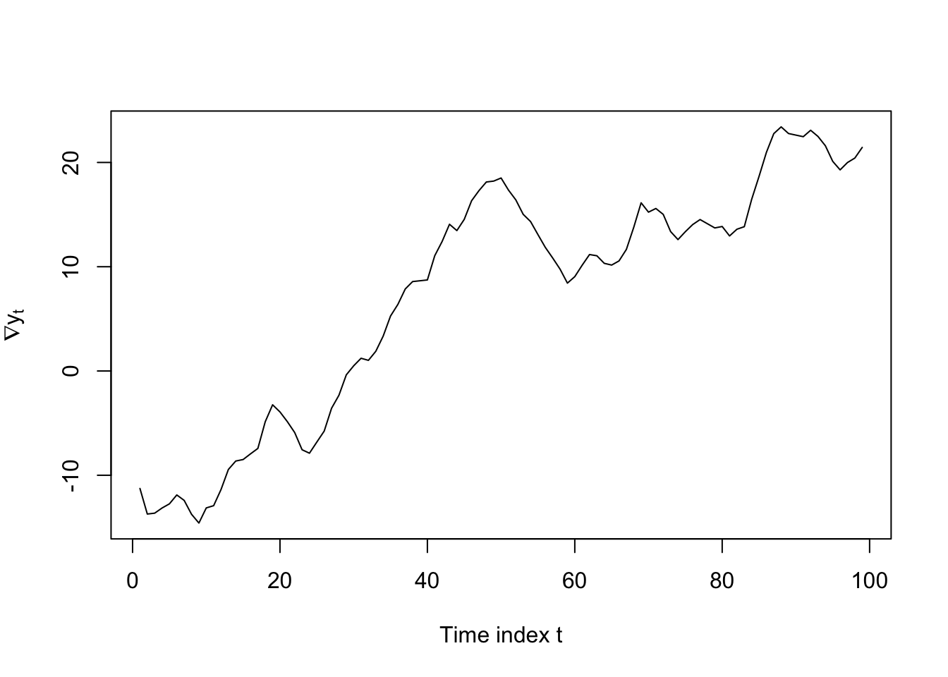 plot(diff(Y[4:103]),type='l',ylab=expression(nabla*y[t]),xlab='Time index t')