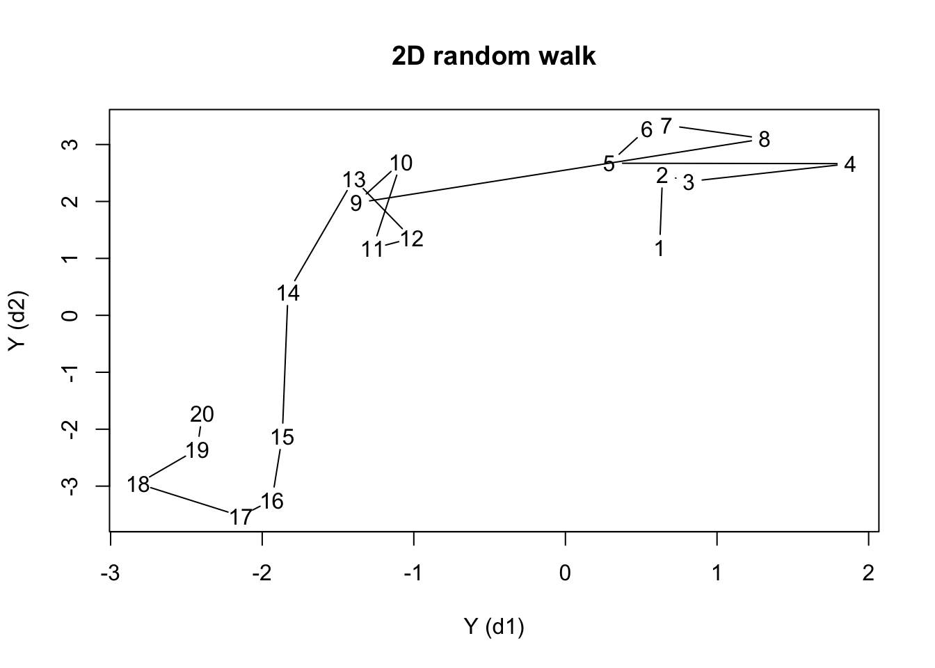 plot(rw_c,type='b',pch=NA,xlab='Y (d1)',ylab='Y (d2)',main='2D random walk')