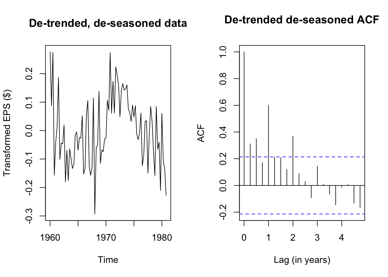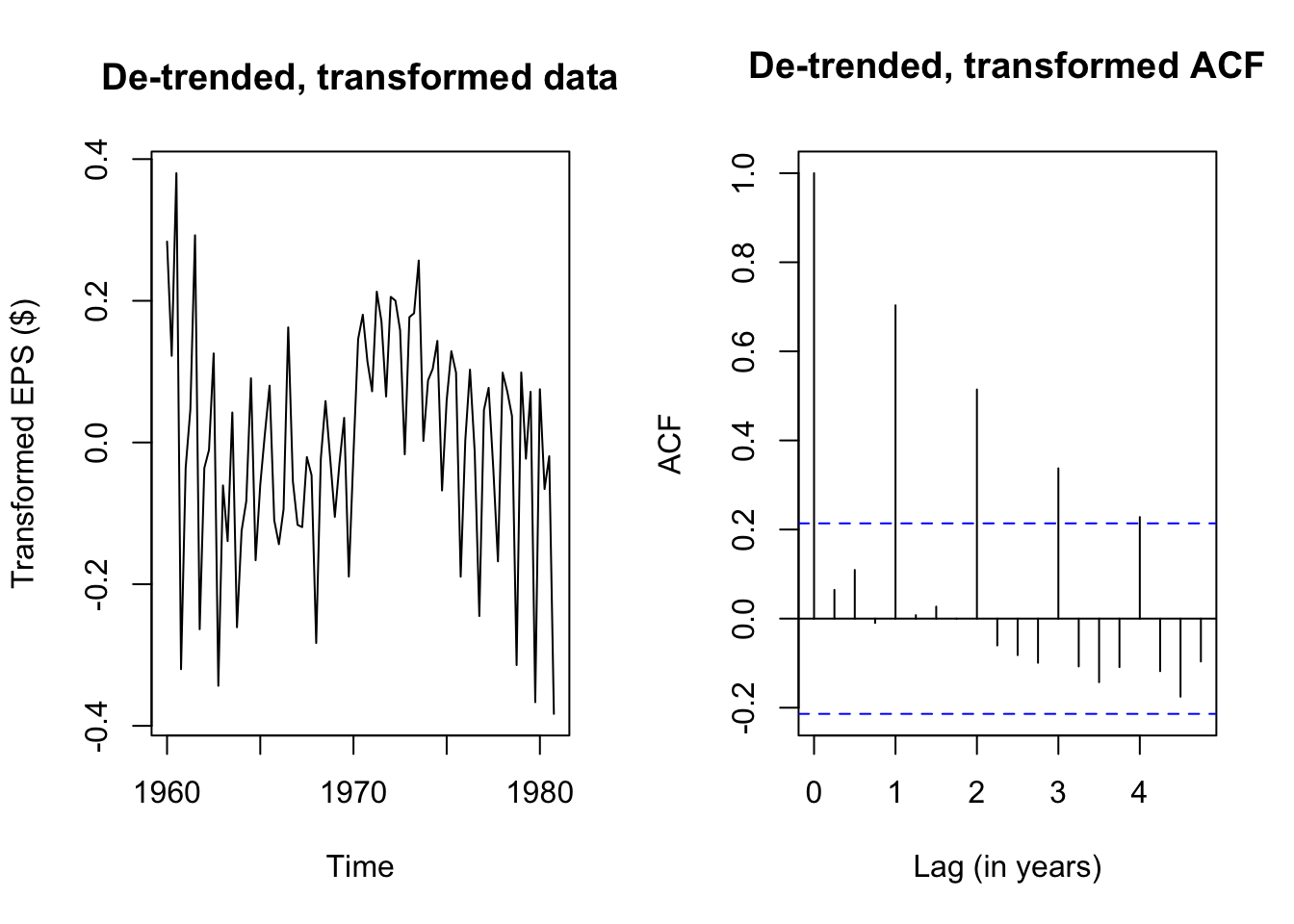plot(eps_boxcox_detrend,main='De-trended, transformed data',ylab='Transformed EPS ($)')