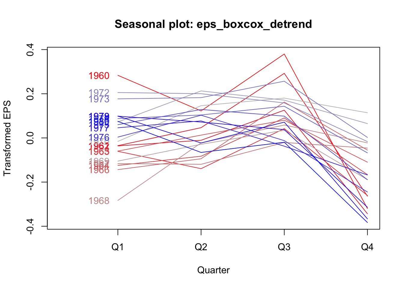 The Box-Cox transformation and de-trending successfully removed a lot of the nonstationary behavior, but the remaining autocorrelation is highly seasonal — each transformed EPS observation is very similar to the EPS from four quarters ago (and thus eight, and twelve…). If we plot the quarterly earnings by year (or each year’s earnings by quarter), we can see this pattern more plainly, where Q3 usually brings very strong earnings for J&J, while Q4 brings weaker earnings: