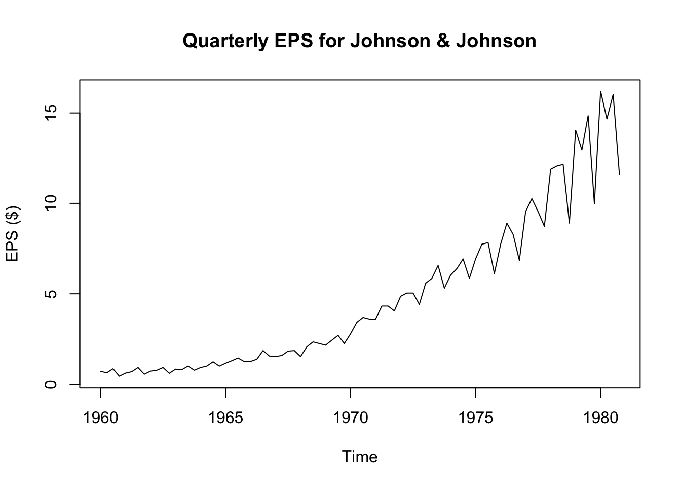 plot(JohnsonJohnson,ylab='EPS ($)',main='Quarterly EPS for Johnson & Johnson')