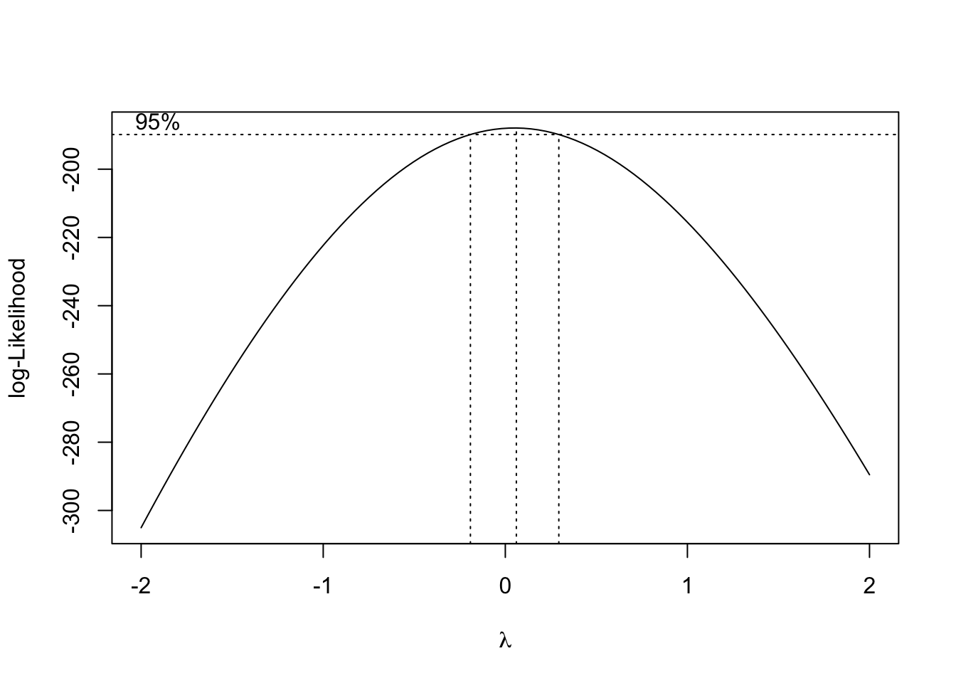 Although the J&J EPS data is nonstationary, neither is it a true Gaussian random walk, since it it very steadily increases and the variance seems to increase over time. This is probably a good candidate for a Box-Cox transformation. Note that the MASS::boxcox function requires a model or formula as its input, and not the raw time series vector. We can create a simple “intercept only” model for the J&J EPS data.