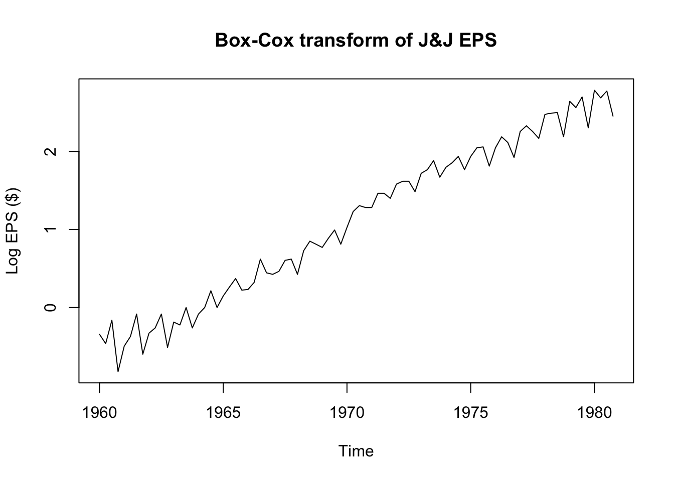 plot(log(JohnsonJohnson),ylab='Log EPS ($)',main='Box-Cox transform of J&J EPS')