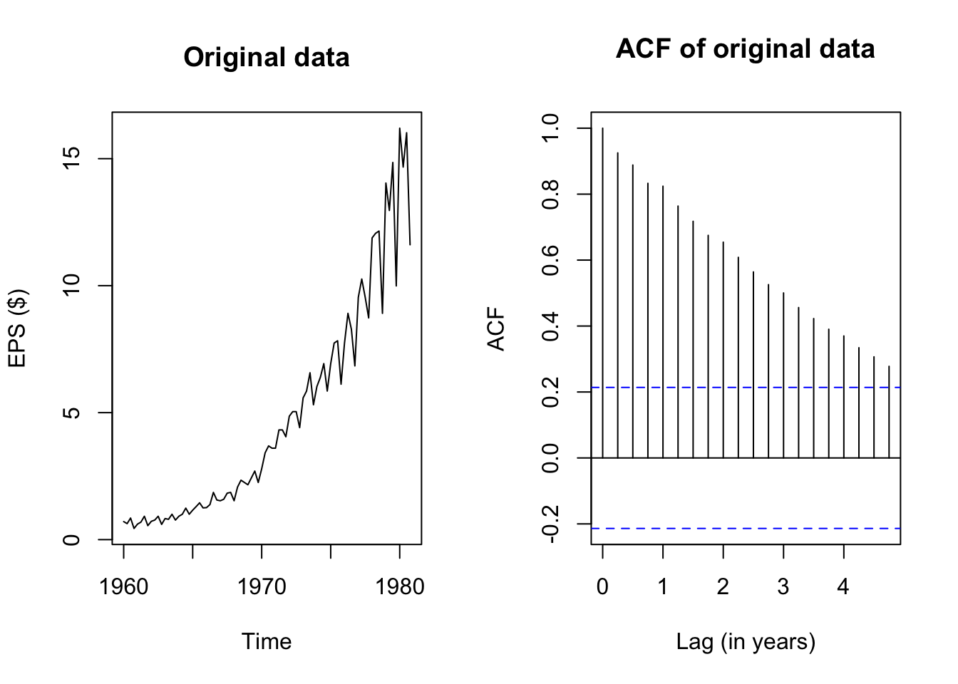 acf(JohnsonJohnson,plot=FALSE)$acf[1:5][1] 1.0000000 0.9251021 0.8882631 0.8328480 0.8240770
