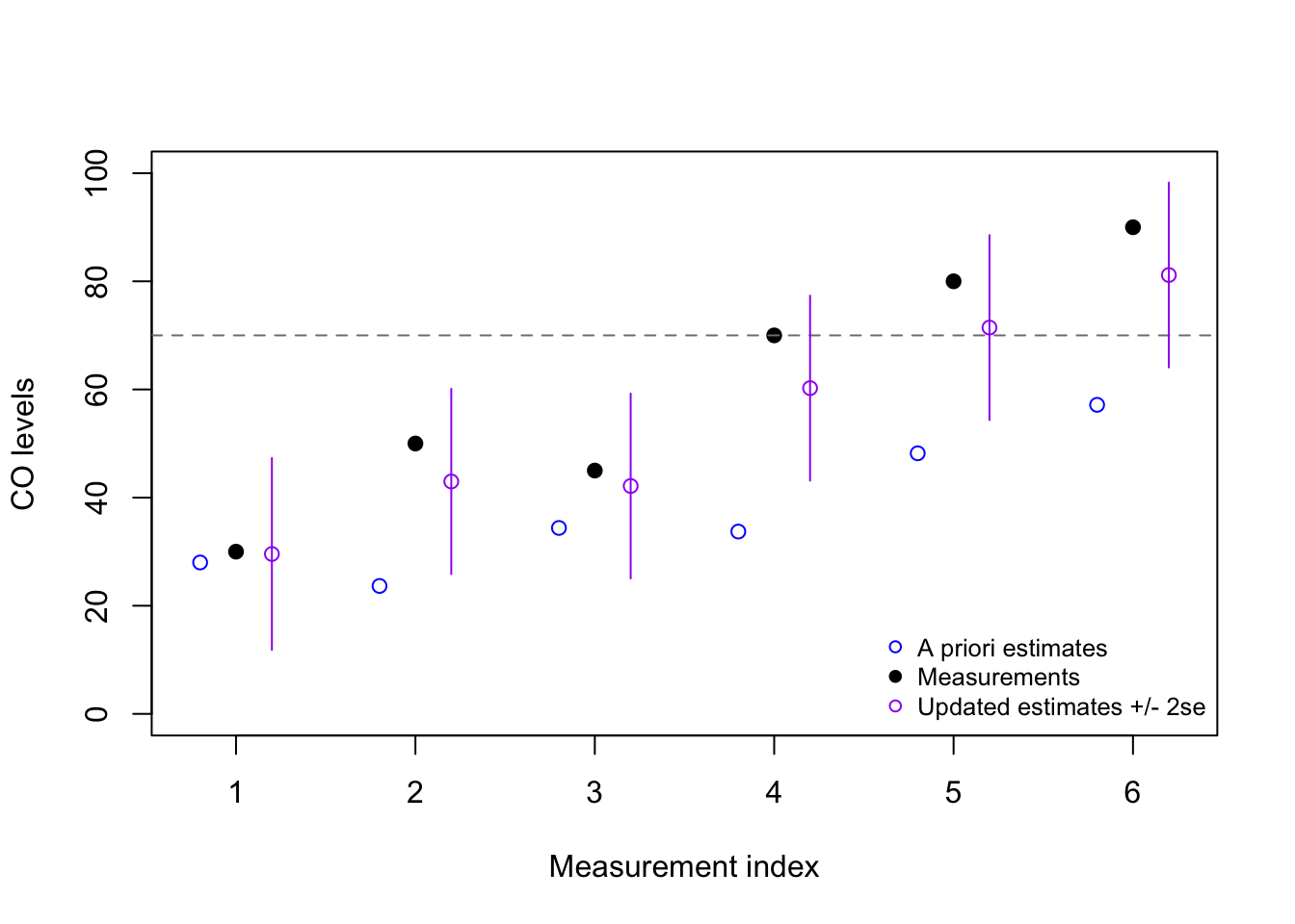 From this example, we might decide to sound the alarm after the fifth reading (80), since our updated estimate is now above the threshold value of 70 ppm. However, it may be more prudent for us to only sound the alarm when we have considerable confidence that the true CO state is above 70 ppm, in which case we may not even sound the alarm after the sixth reading (90)!