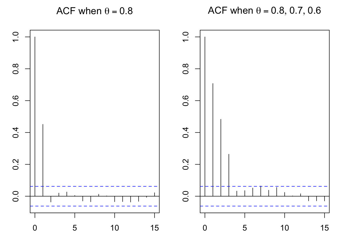 par(mfrow=c(1,2),mar=c(3.1,3.1,3.1,1.1))set.seed(0108)ma08 <-arima.sim(list(ma=0.8),n=1000)ma080706 <-arima.sim(list(ma=c(0.8,0.7,0.6)),n=1000)acf(ma08,main=expression(paste('ACF when ',theta ==0.8)),lag.max=15)acf(ma080706,main=expression(paste('ACF when ',theta ==list(0.8,0.7,0.6))),lag.max=15)