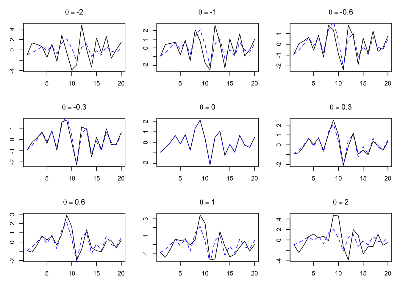 Positive and negative values of \(\theta\) produce similar patterns, with no parameter choice creating the alternating series seen in the AR(1) models.