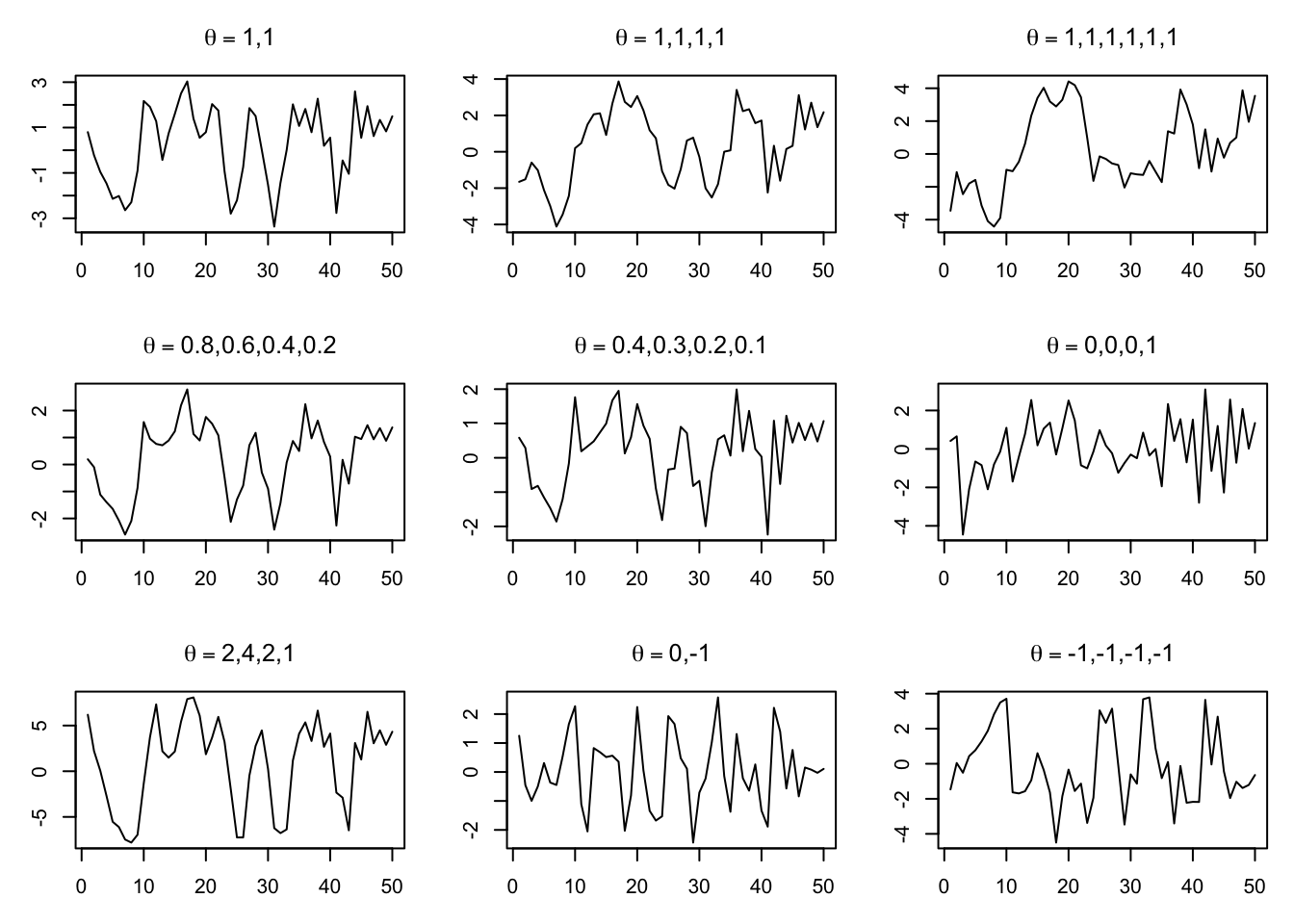 For some \((\theta_1, \theta_2, \ldots, \theta_q) \in \mathbb{R}^q\) and all \(t \in T\), then we say that \(\boldsymbol{Y}\) is an moving average model with orderq.