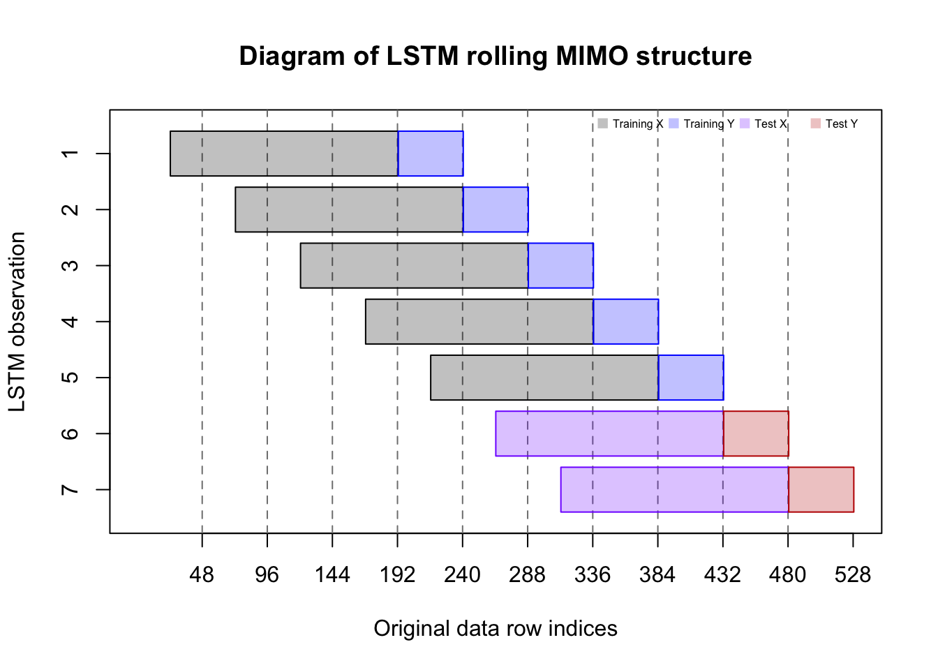 rawpreds*lstm.sds[1]+lstm.means[1]}The code above describes a MIMO forecasting strategy for the neural network which exploits structures in the data we have not yet used. Until now, we have approached each 24-hour (48 observation day) as its own entity, whether we were forecasting recursively or directly.