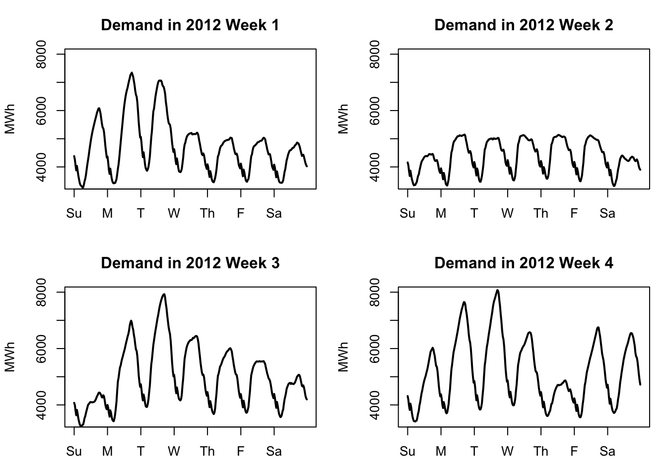 However, the graphs above (from early 2012) show that the demand pattern is not identical day-to-day or week-to-week. Week 2 shows a very regular pattern like we might expect, with Monday–Friday having very similar demand and both Sunday and Saturday showing somwehat less demand. But other weeks show a very different pattern. It might be difficult to forecast this series with a fixed set of daily or hourly coefficients.