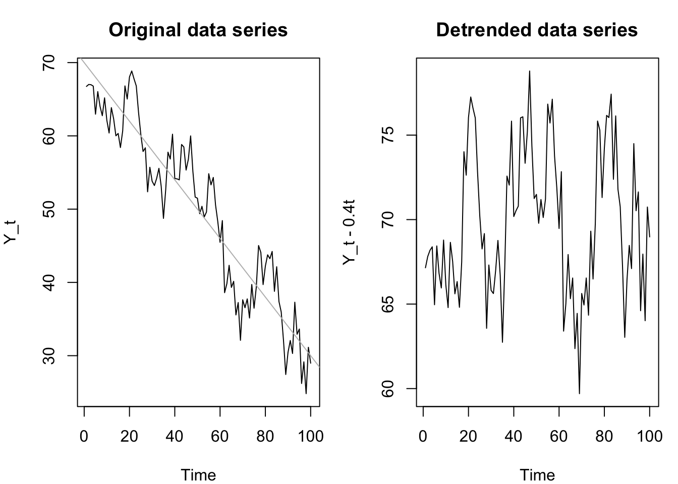 plot(tsts + 0.4*(1:100),ylab='Y_t - 0.4t',main='Detrended data series')