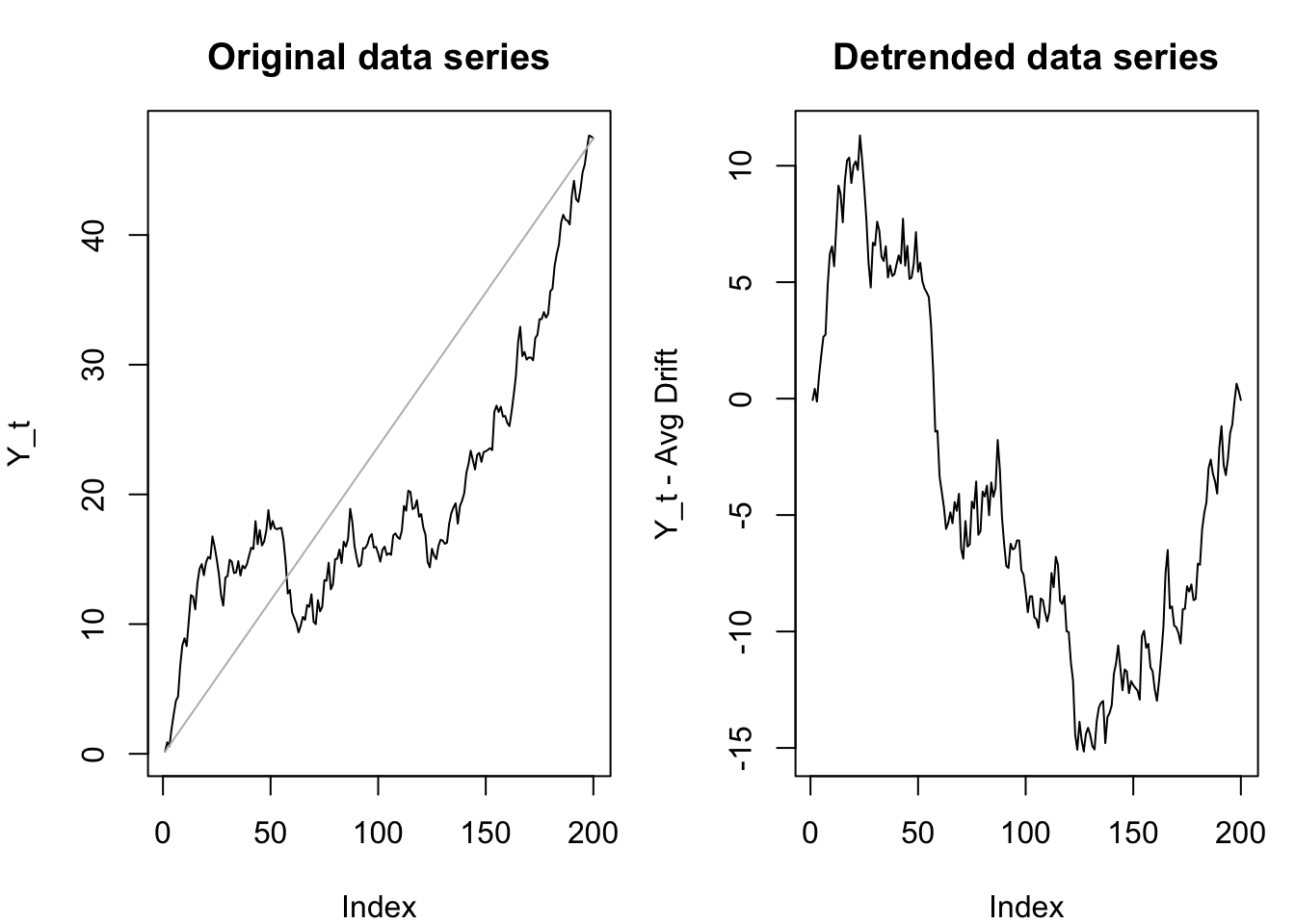plot(rw-(1:n)*(rw[n]-rw[1])/(n-1),ylab='Y_t - Avg Drift',main='Detrended data series',type='l')