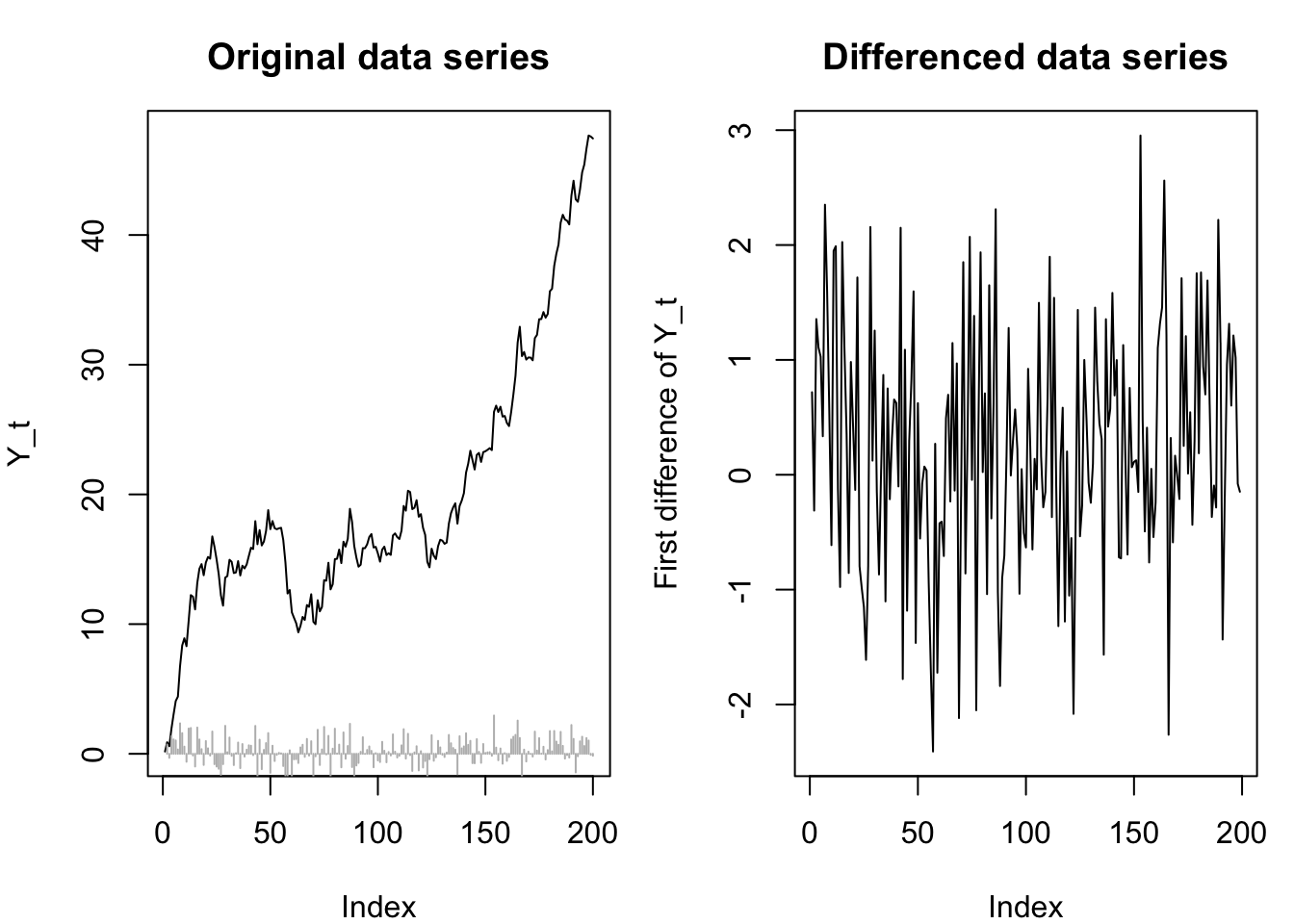 Then \(\boldsymbol{Y}\) is a difference-stationary time series, and if \(X_t = \nabla Y_t\) then \(\boldsymbol{X}\) is a weakly stationary time series.