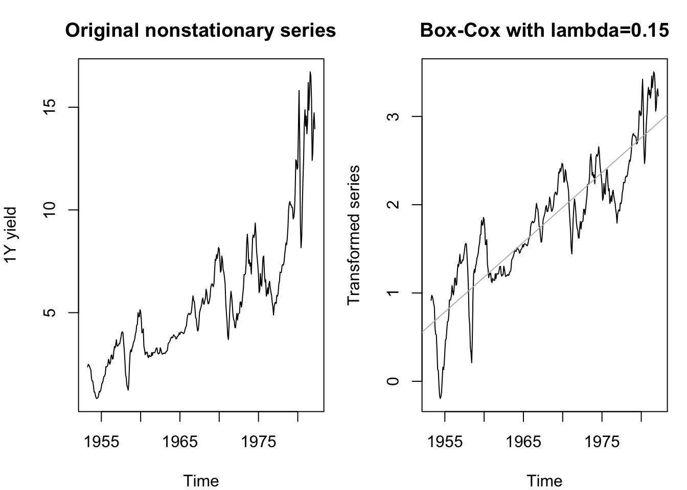 abline(reg=lm(box_cox(yields,0.15)~time(yields)),col='#bbbbbb')
