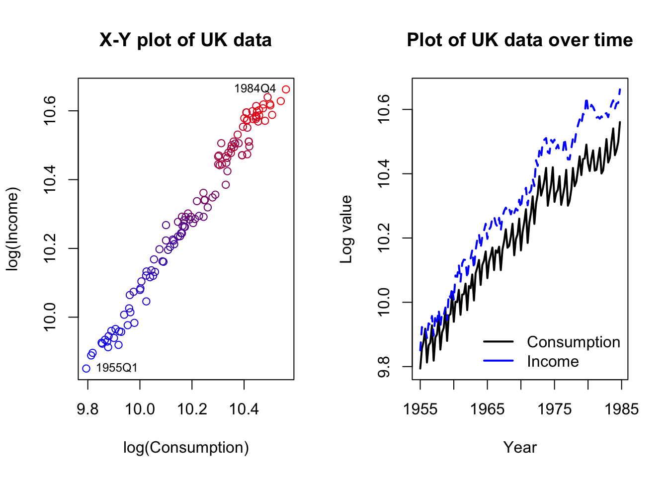 Let’s consider a simple example with only two series. The dataset describes consumption (i.e. expenditures) and incomes in the United Kingdom, during the 120 quarters from 1955 through 1984.
