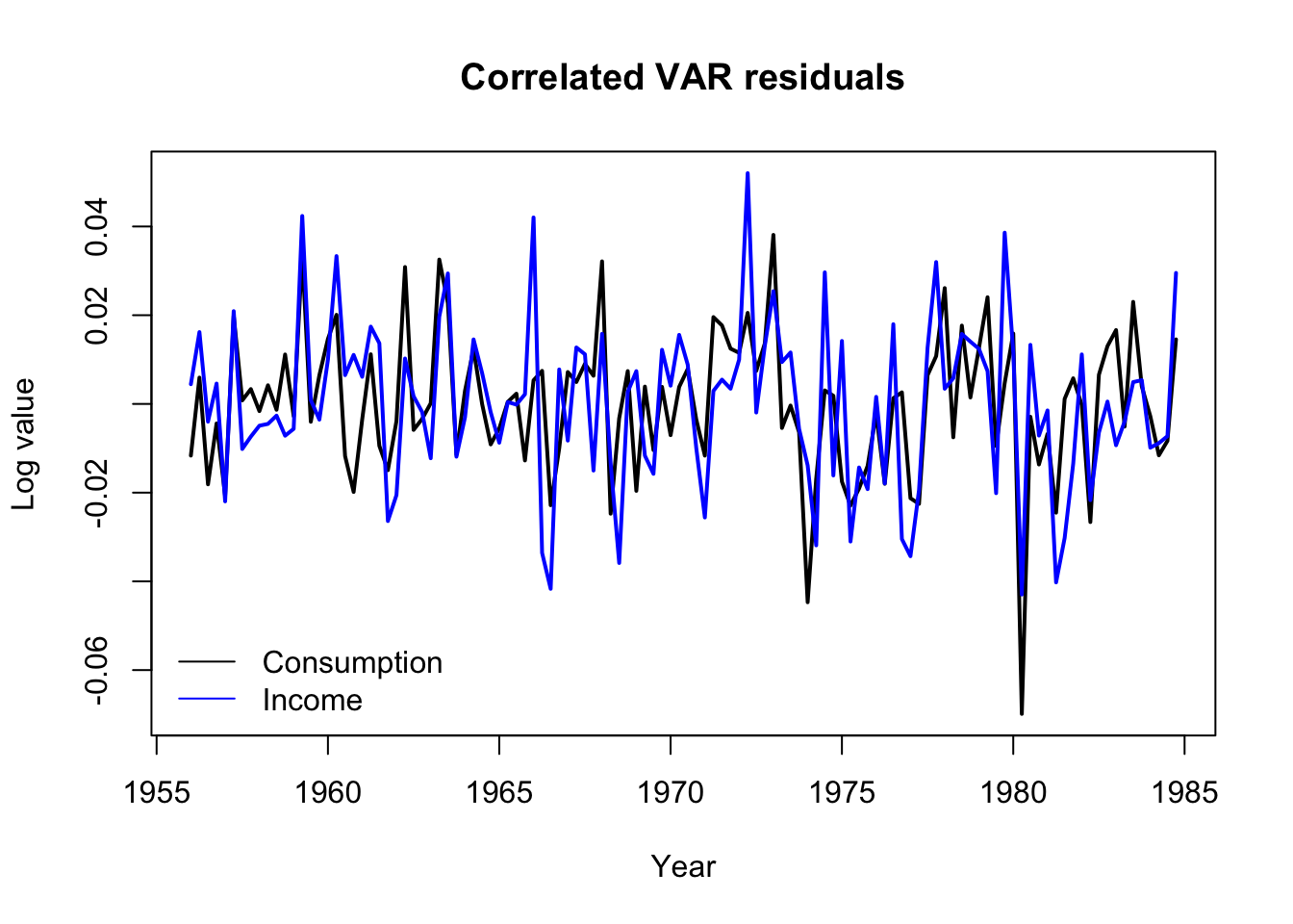main='Correlated VAR residuals',lty=1,col=c('#000000','#0000ff'))